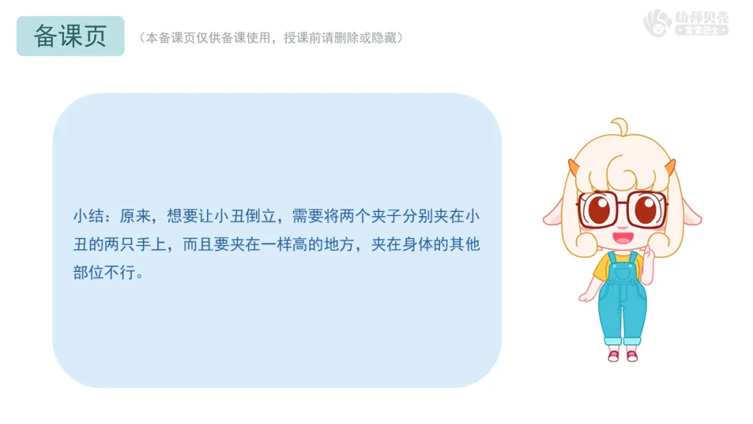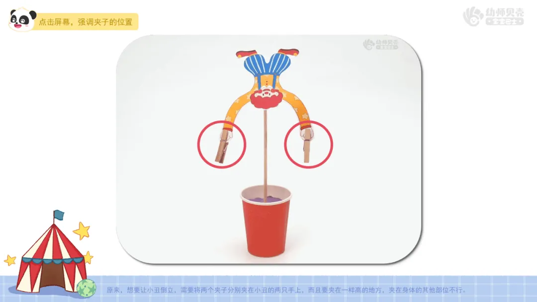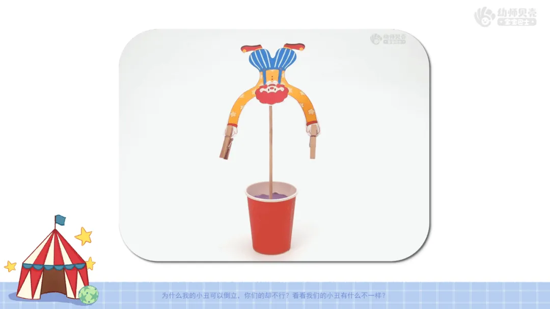 4.发现结论:根据幼儿操作结果,引导幼儿思考,发现小丑倒立与辅助物位置的关系。