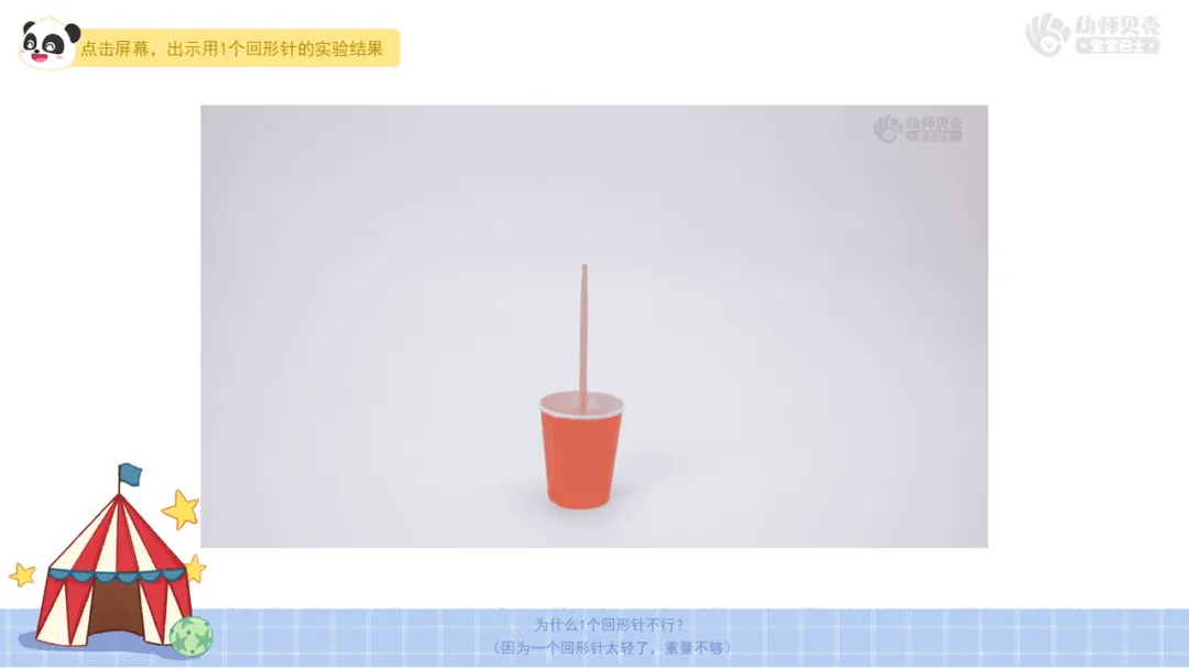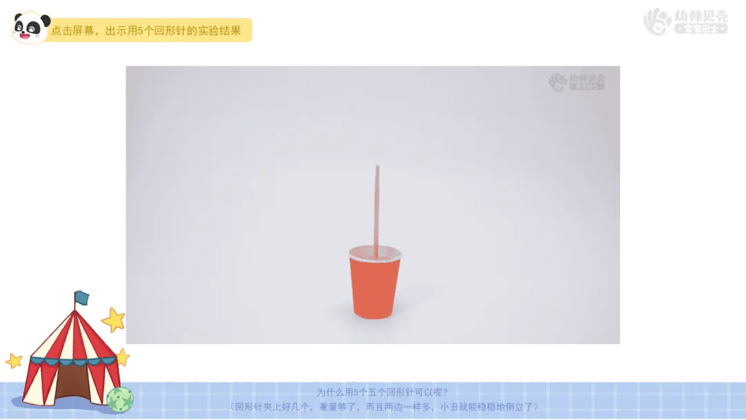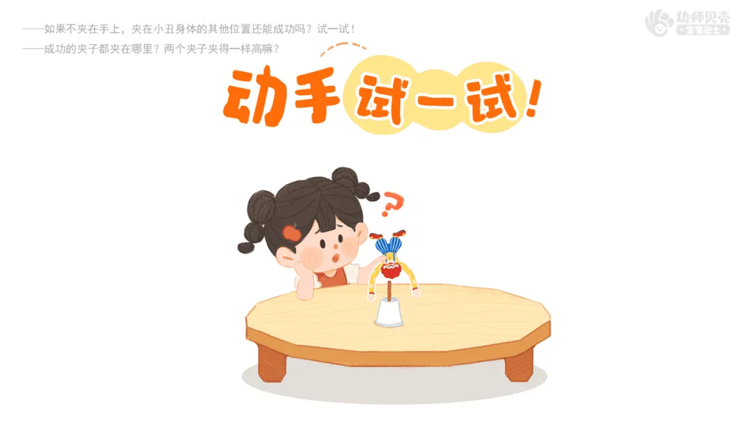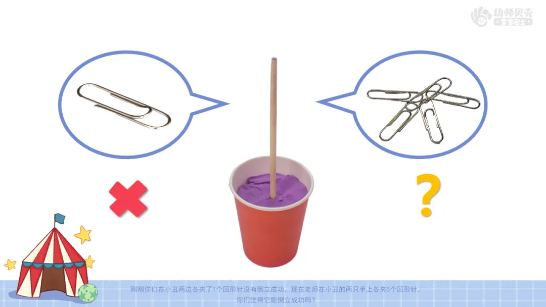 ——刚刚你们在小丑两边各夹了1个回形针没有倒立成功,现在老师在小丑的两只手上各夹5个回形针,你们觉得它能倒立成功吗?
