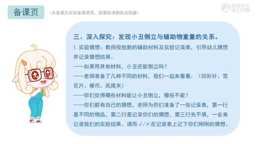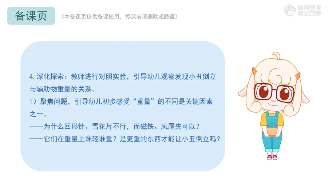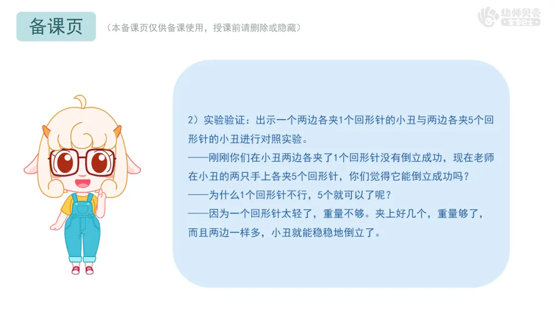 2.难点化解得当:“发现小丑成功倒立与辅助物位置及重量的关系”这一难点,通过“分步探究,隔离变量”的设计得以有效化解。先固定重量探索位置,再固定位置探索重量,这种由简到繁、层层递进的安排符合幼儿思维特点,让他们能清晰地聚焦一个变量进行探索,最终自己建构起“既要位置对,也要重量够”的核心概念。最后的“1个与5个回形针”的对照实验是点睛之笔,成功引导幼儿的思维从具体材料走向抽象概念。