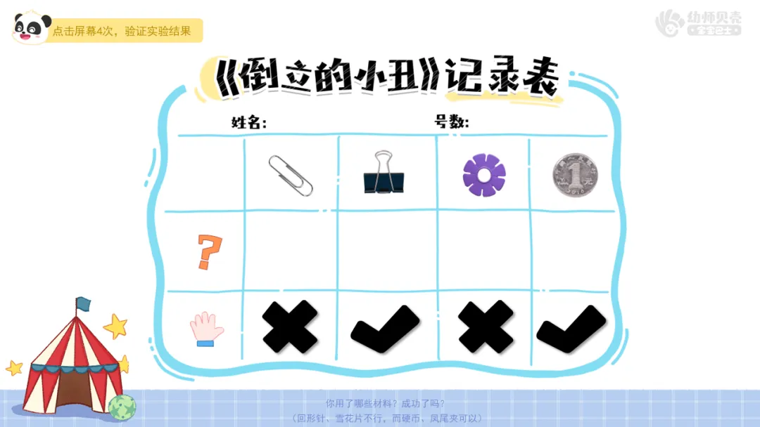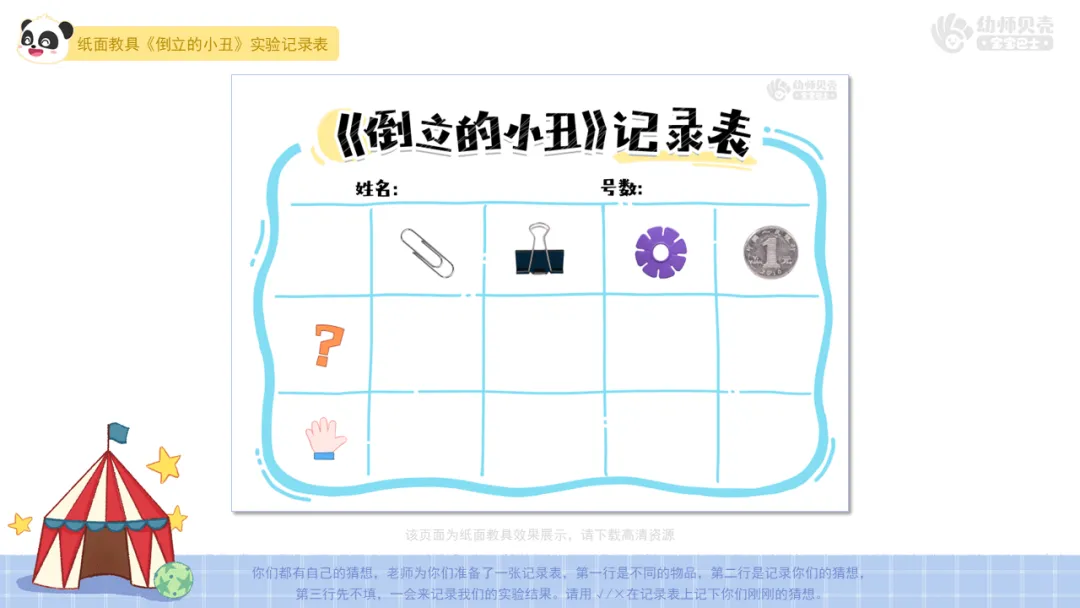l能够动手操作不同材料,尝试让小丑倒立;学习用简单的符号记录自己的猜想和实验结果,并能与同伴交流分享。