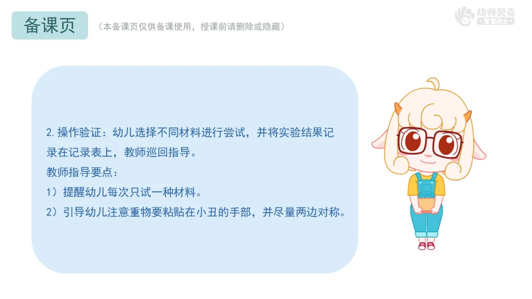 3)操作探究法:这是最核心的方法。提供充足的材料和时间,让幼儿通过初次自由探索(发现位置需求)、观察对比(聚焦关键差异)、深度探究实验(验证重量关系)等动手操作环节,主动建构知识。