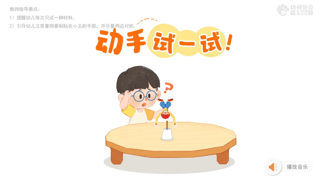 1.重点:动手操作各种材料尝试让小丑倒立,并学习用简单的符号记录自己的猜想和实验结果。