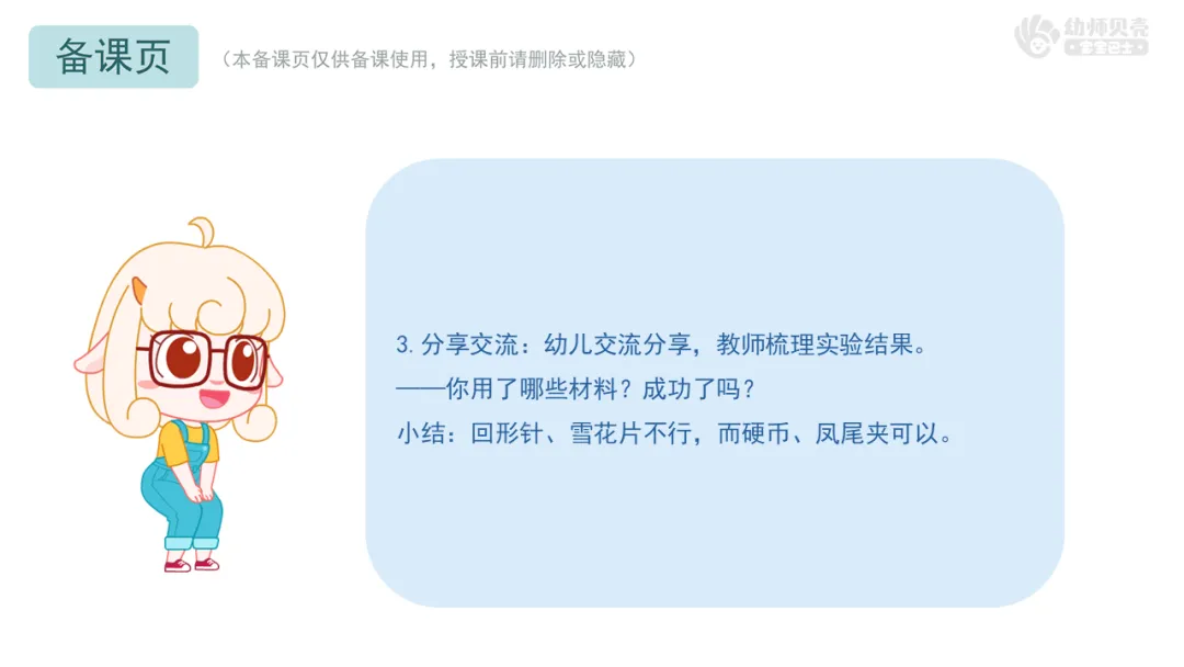 2.分享环节的深度可加强:幼儿在分享时更多是描述操作结果(“我成功了/失败了”),对于“为什么”的深入解释还显不足,多依赖于教师的提炼。