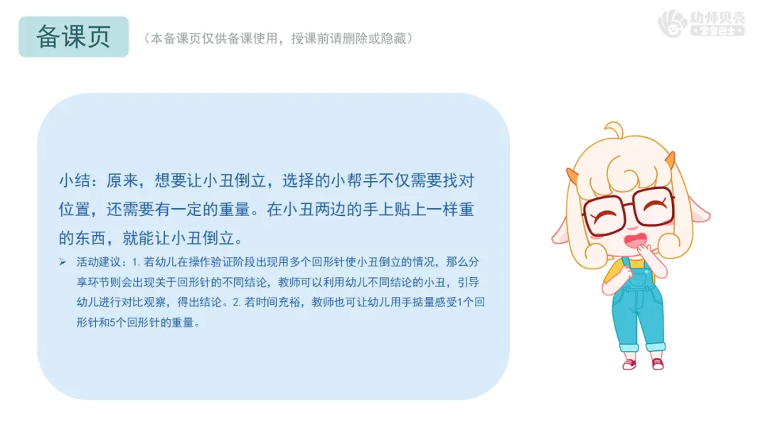 Ø活动建议:1.若幼儿在操作验证阶段出现用多个回形针使小丑倒立的情况,那么分享环节则会出现关于回形针的不同结论,教师可以利用幼儿不同结论的小丑,引导幼儿进行对比观察,得出结论。2.若时间充裕,教师也可让幼儿用手掂量感受1个回形针和5个回形针的重量。