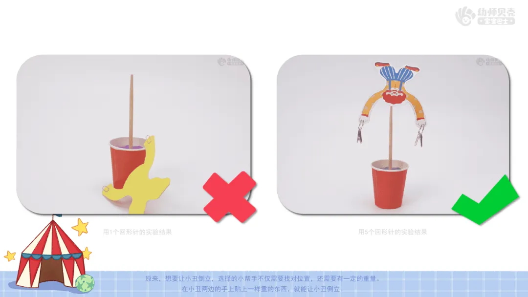 4.深化探索:教师进行对照实验,引导幼儿观察发现小丑倒立与辅助物重量的关系。