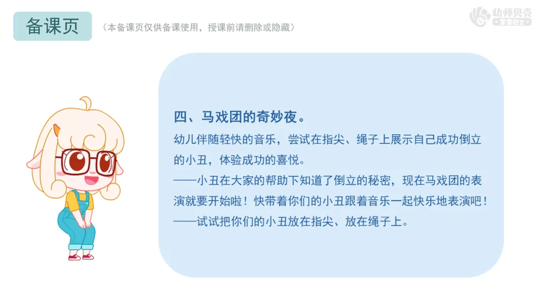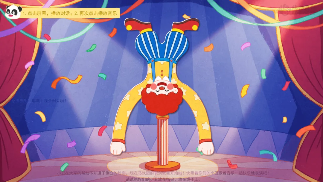 ——小丑在大家的帮助下知道了倒立的秘密,现在马戏团的表演就要开始啦!快带着你们的小丑跟着音乐一起快乐地表演吧!