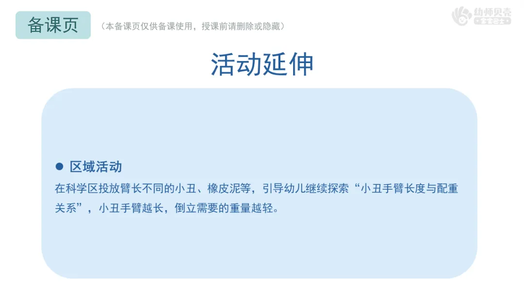 最后,是简洁的小结与延伸。我会用儿童化的语言总结核心发现:“今天我们真厉害,帮小丑找到了倒立的两个秘密:一要夹对地方,二要够分量!”并将探索兴趣延伸至科学区,鼓励幼儿继续探索臂长不同的小丑所需的配重关系。