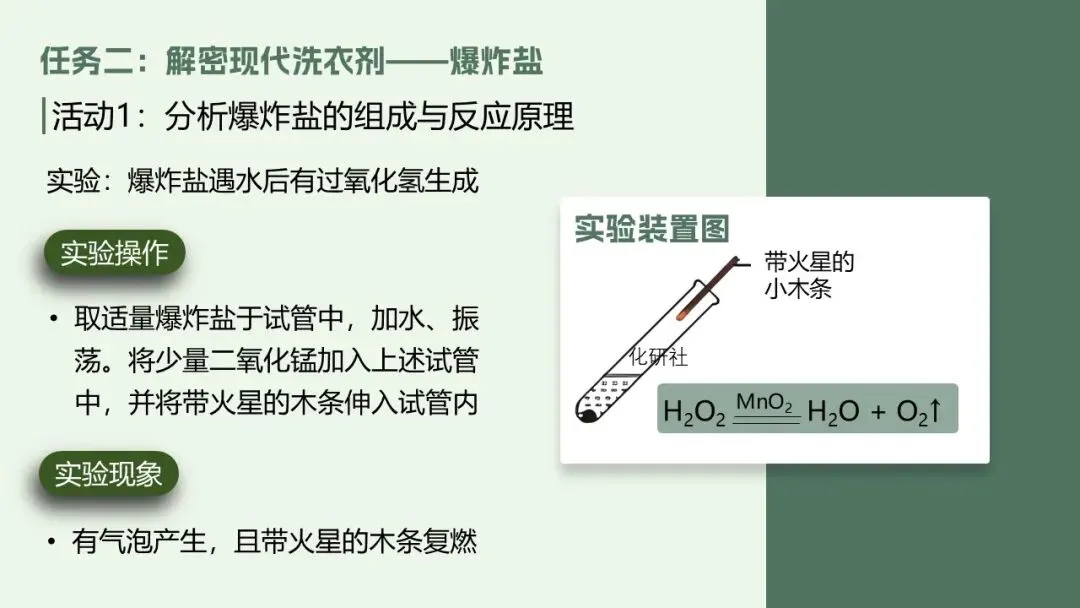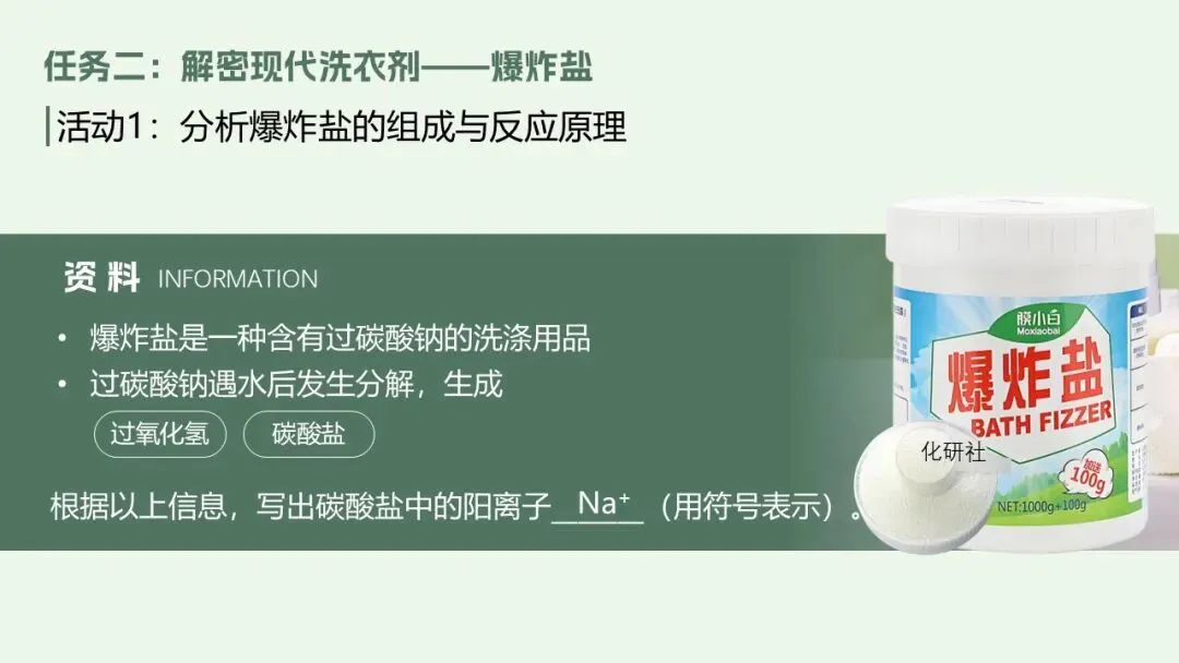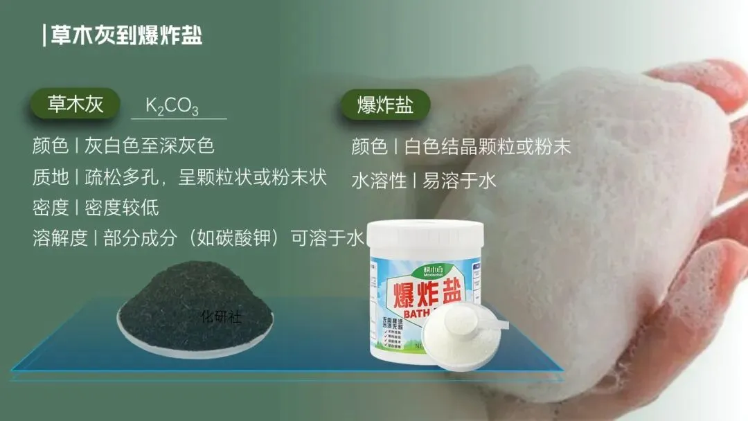 观察图片,结合生活经验猜测草木灰和爆炸盐的去污原理,激发探究兴趣,初步感知化学与生活、历史的关联。