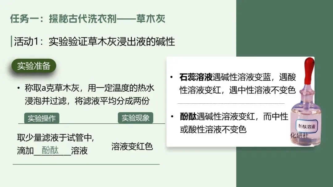 布置实验任务:“称取 a 克草木灰,用热水浸泡过滤,取滤液验证其酸碱性”,提供实验试剂(酚酞溶液、石蕊溶液),引导学生选择合适试剂并解释原因。