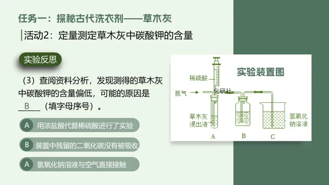 提出问题:“实验测得碳酸钾含量偏低,可能的原因有哪些?” 提供选项(A. 用浓盐酸代替稀硫酸;B. 装置中残留的 CO₂未被吸收;C. 氢氧化钠溶液与空气直接接触),引导学生分组讨论。