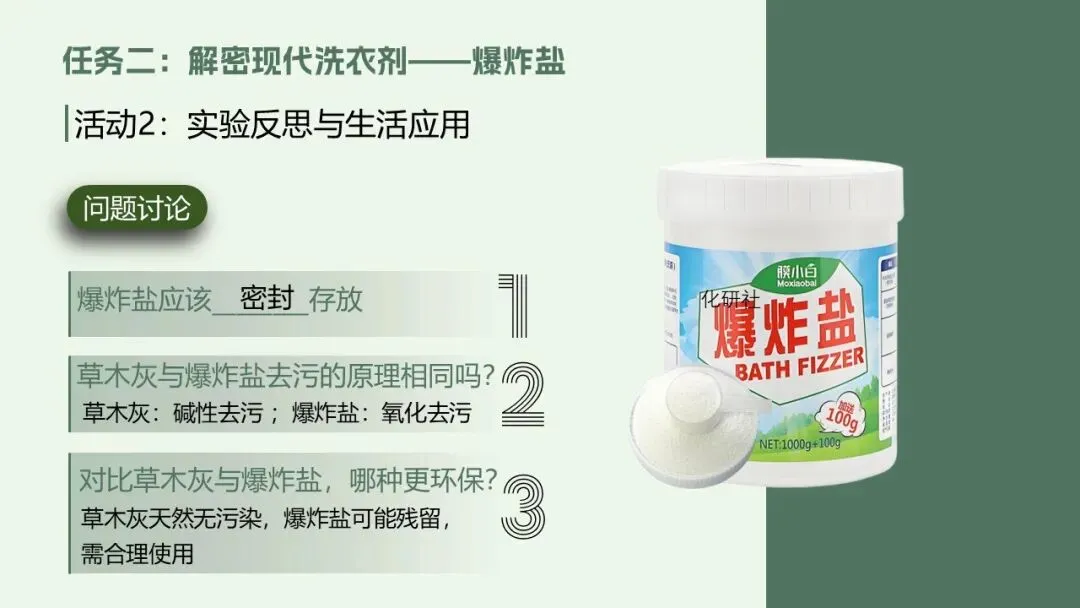 展示古代用草木灰洗衣、现代用爆炸盐洗衣的场景图片,提出问题:“从古代的草木灰到现代的爆炸盐,洗衣剂的变化背后藏着怎样的化学奥秘?为什么不同时代会选择不同的洗衣剂?” 引出本节课主题:“洗衣剂的化学奥秘 —— 从草木灰到爆炸盐的科学探究”。