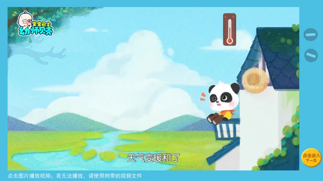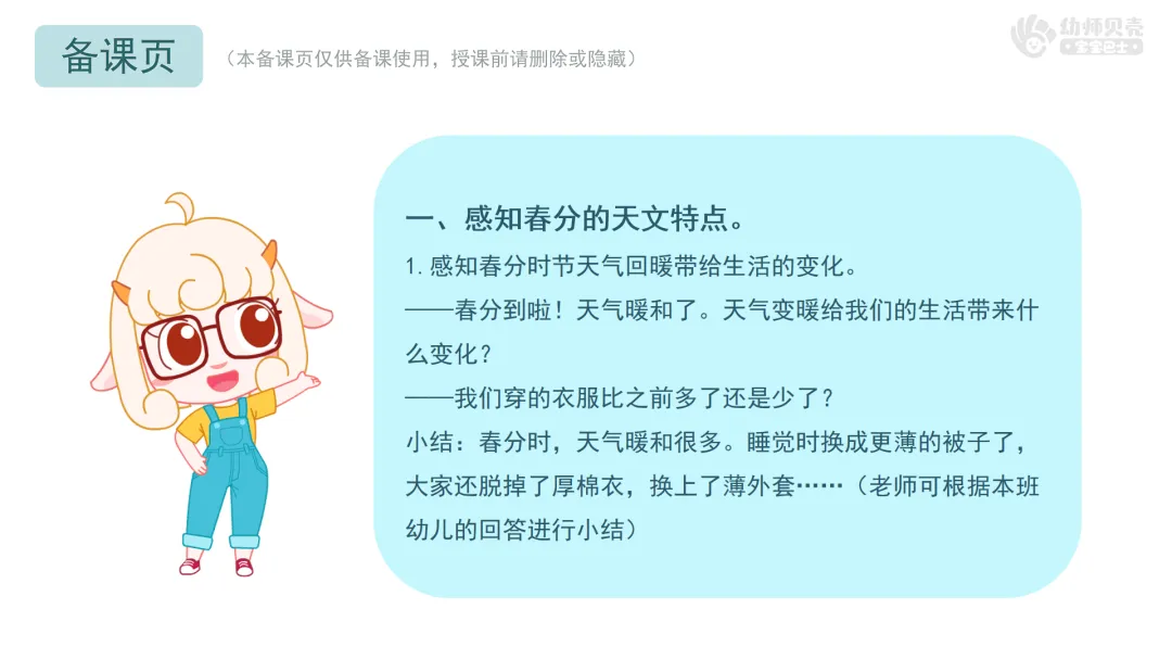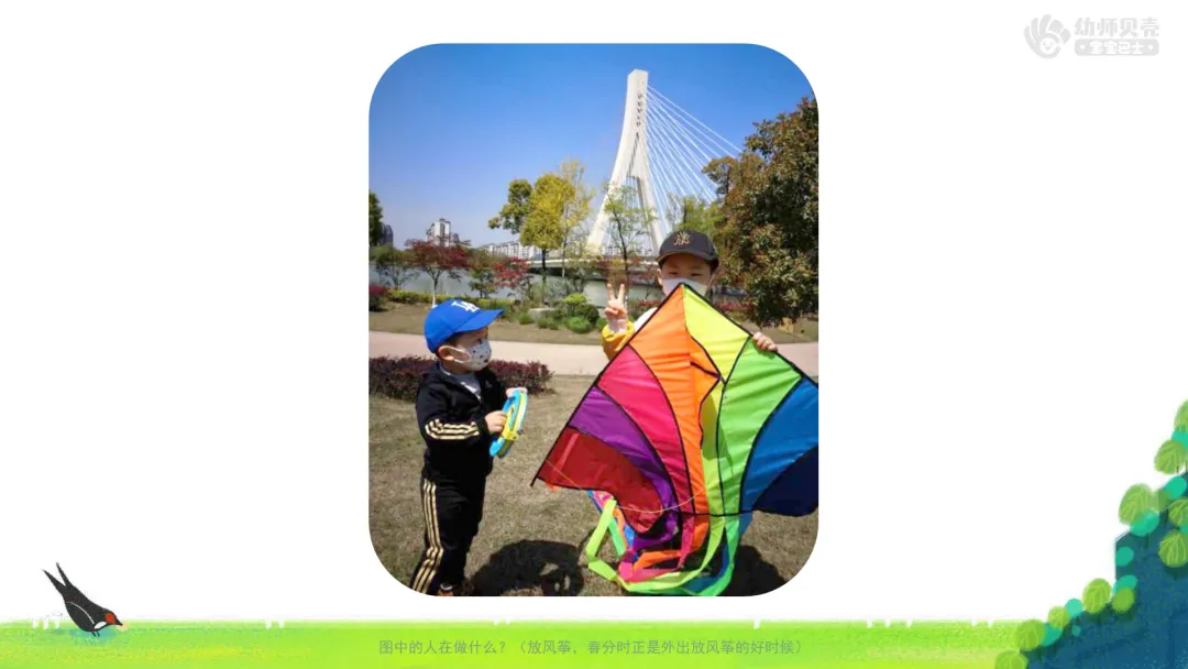 小结:春分时,天气暖和很多。睡觉时换成更薄的被子了,大家还脱掉了厚棉衣,换上了薄外套……(老师可根据本班幼儿的回答进行小结)