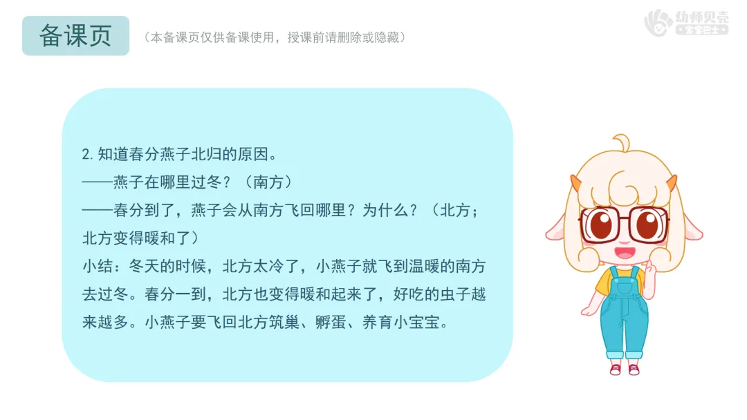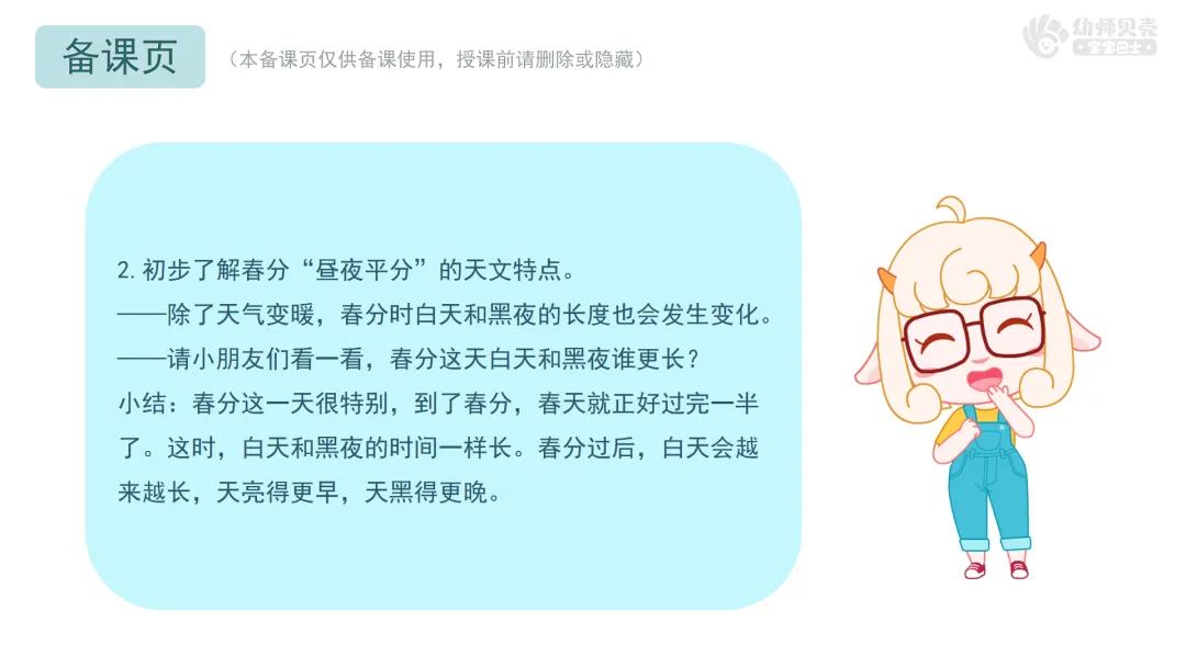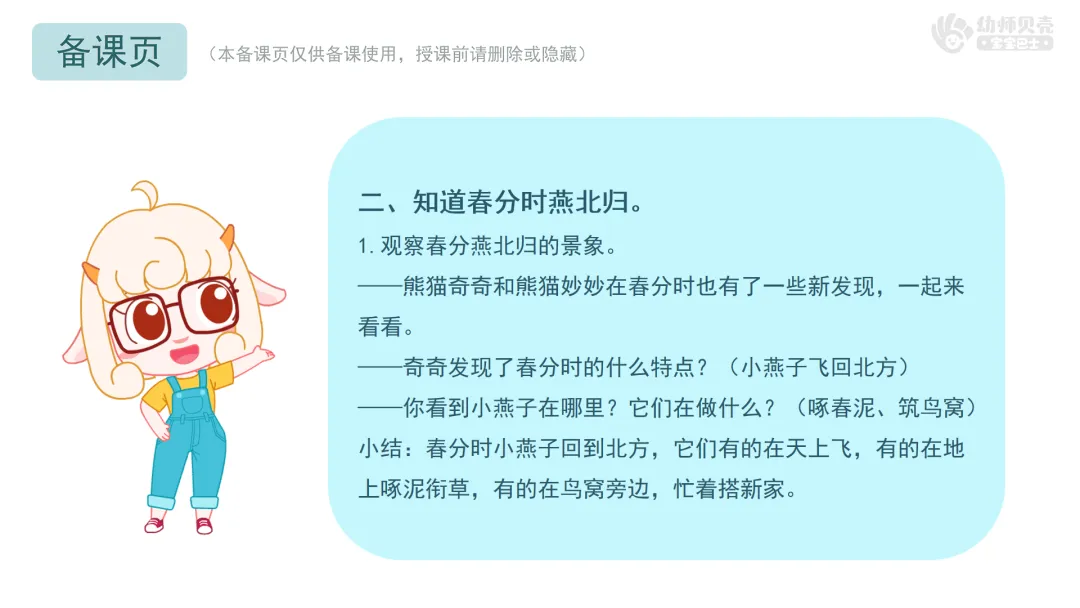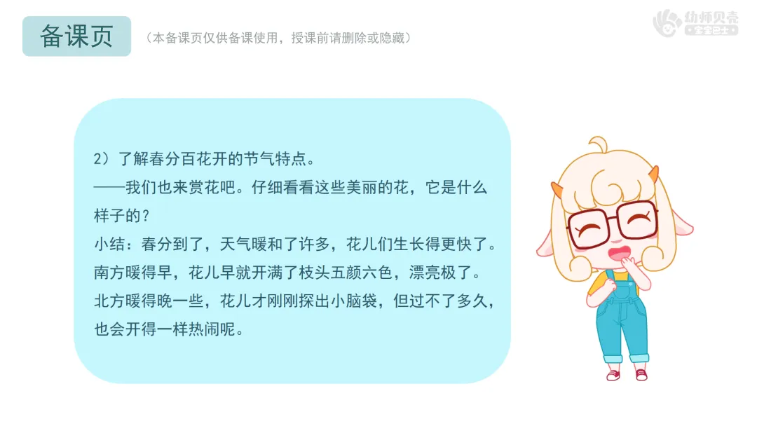 l重点:了解春分昼夜平分、燕北归、百花开的节气特点。