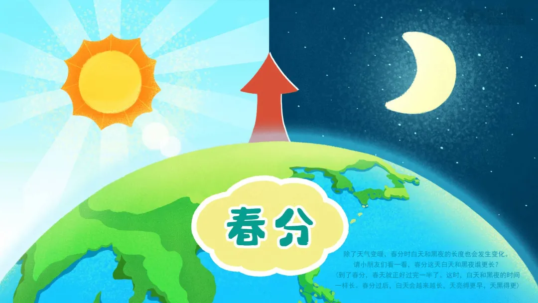 小结:春分这一天很特别,到了春分,春天就正好过完一半了。这时,白天和黑夜的时间一样长。春分过后,白天会越来越长,天亮得更早,天黑得更晚。
