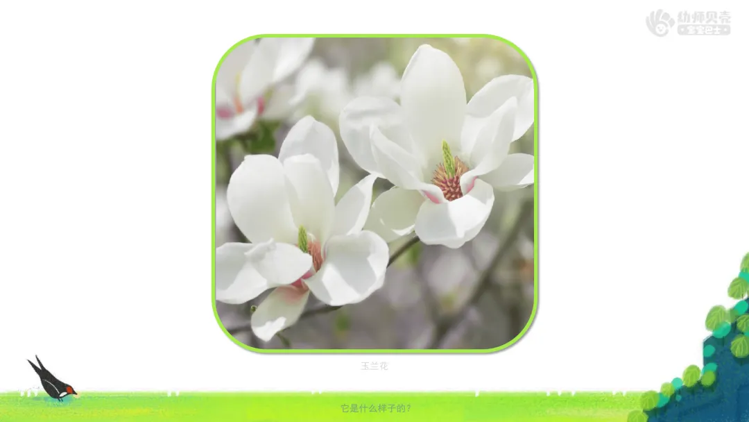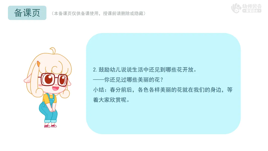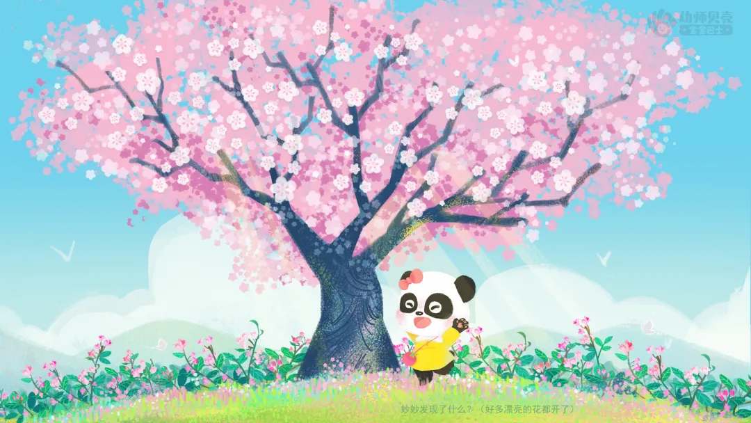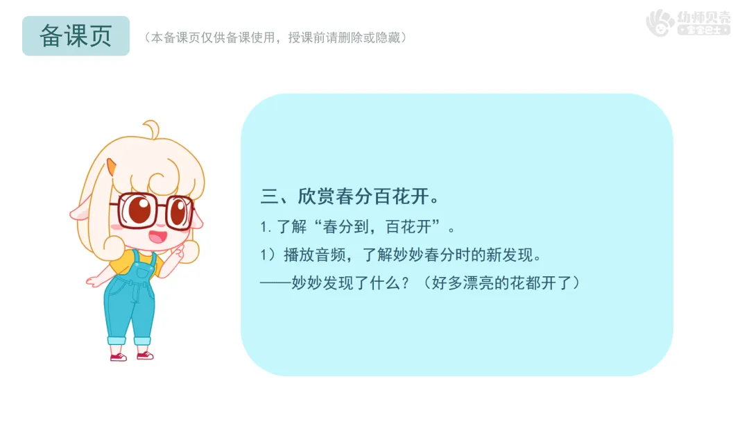三、欣赏春分百花开。1.了解“春分到,百花开”。 1)播放音频,了解妙妙春分时的新发现。