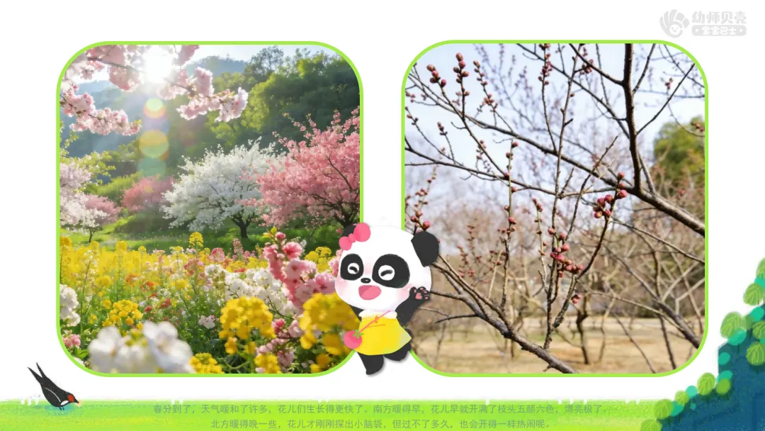 小结:春分到了,天气暖和了许多,花儿们生长得更快了。南方暖得早,花儿早就开满了枝头五颜六色,漂亮极了。北方暖得晚一些,花儿才刚刚探出小脑袋,但过不了多久,也会开得一样热闹呢。