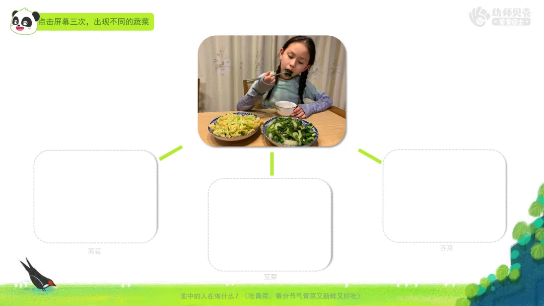 ——春分还有很多好玩的习俗,请你看看图中的人在做什么?(吃青菜,春分节气青菜又新鲜又好吃;放风筝,春分时正是外出放风筝的好时候)