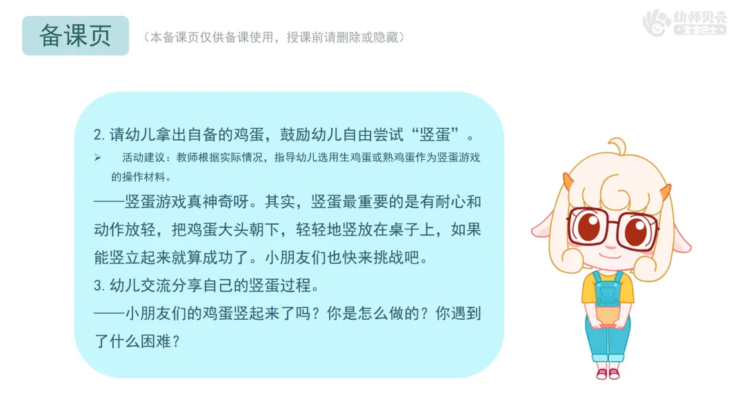Ø活动建议:教师根据实际情况,指导幼儿选用生鸡蛋或熟鸡蛋作为竖蛋游戏的操作材料。