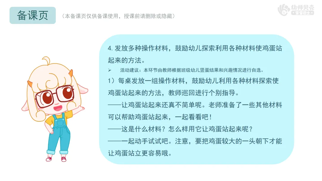 l教师根据实际情况选用生鸡蛋或熟鸡蛋作为幼儿竖蛋的操作材料。