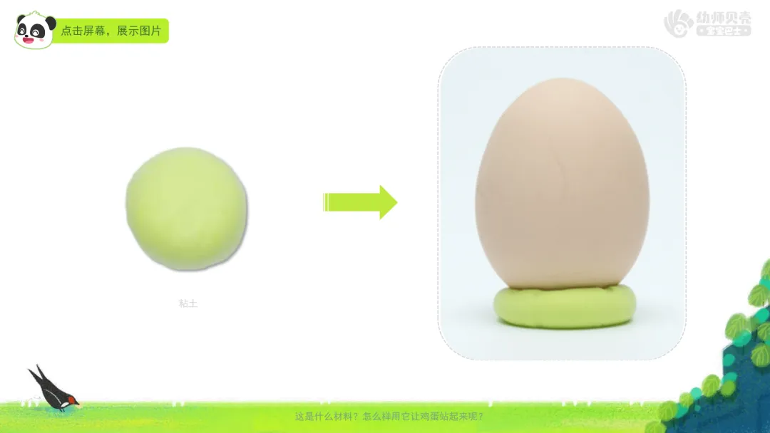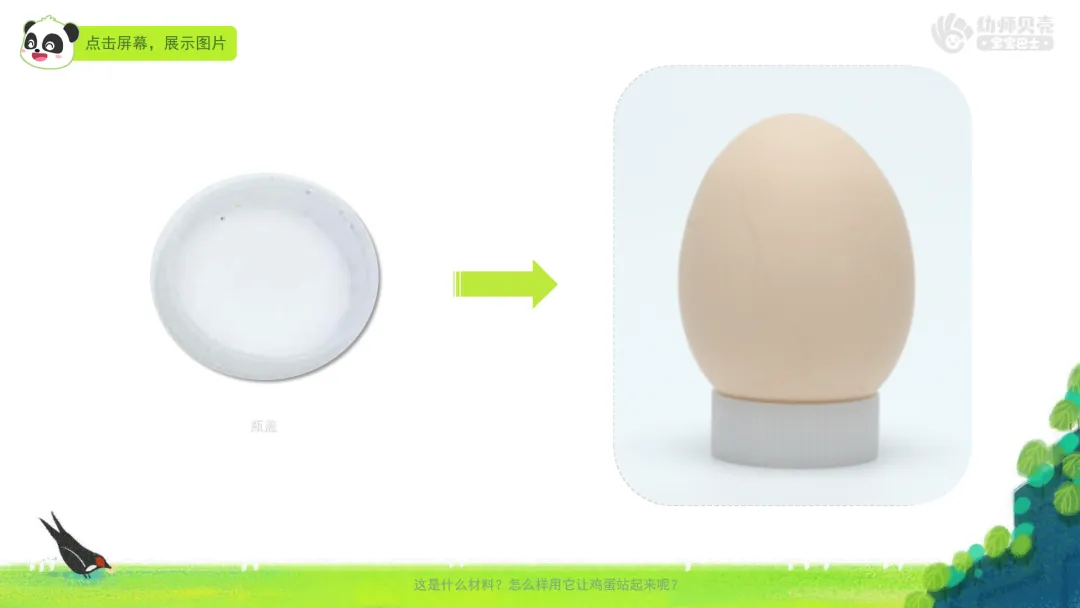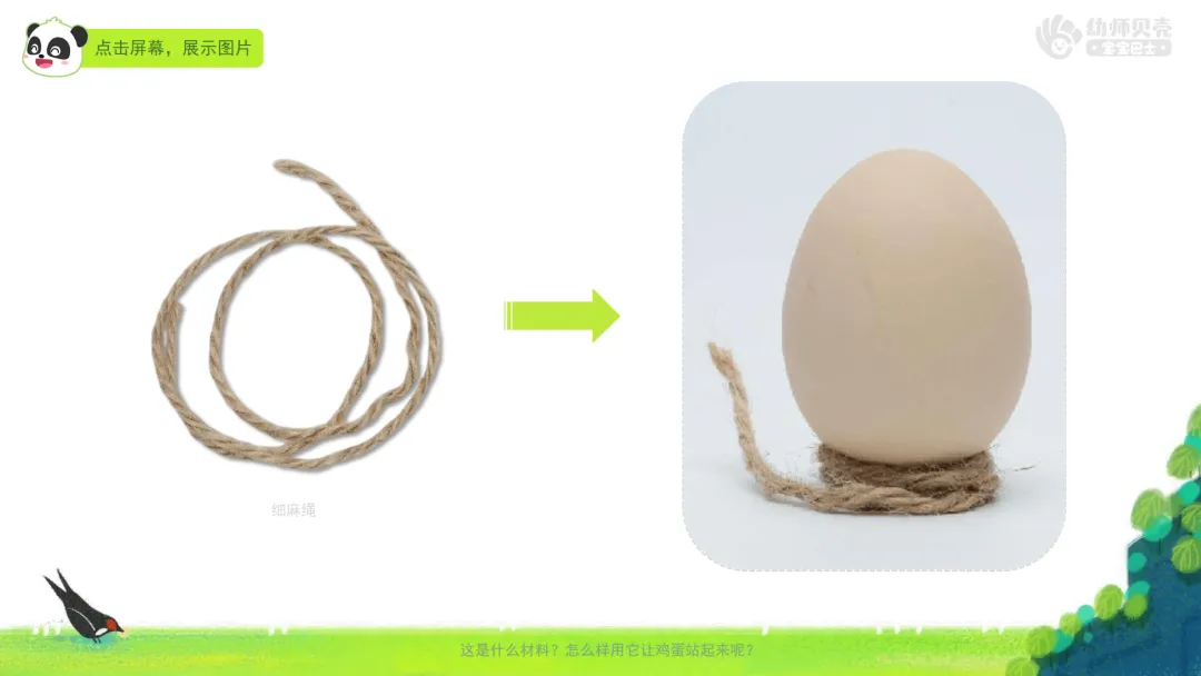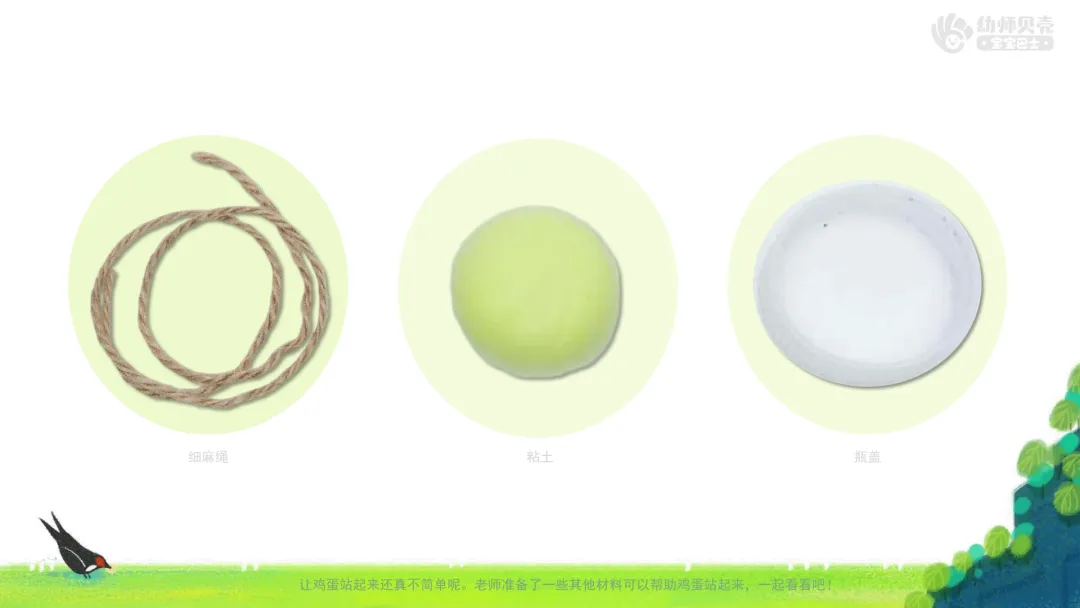 ——让鸡蛋站起来还真不简单呢。老师准备了一些其他材料可以帮助鸡蛋站起来,一起看看吧!