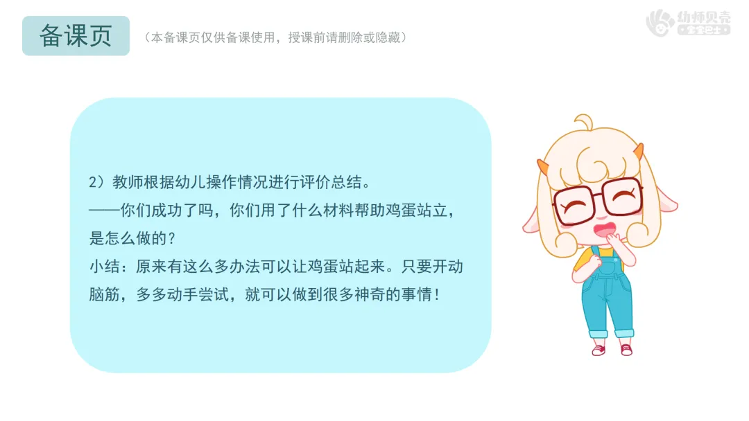 ——一起动手试试吧。注意,要把鸡蛋较大的一头朝下才能让鸡蛋站立更容易哦。 2)教师根据幼儿操作情况进行评价总结。 ——你们成功了吗,你们用了什么材料帮助鸡蛋站立,是怎么做的? 小结:原来有这么多办法可以让鸡蛋站起来。只要开动脑筋,多多动手尝试,就可以做到很多神奇的事情!