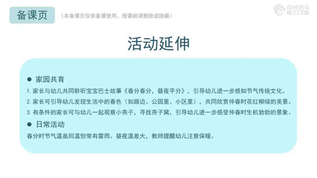 1.家长与幼儿共同聆听宝宝巴士故事《春分春分,昼夜平分》,引导幼儿进一步感知节气传统文化。 2.家长可引导幼儿发现生活中的春色(如路边、公园里、小区里),共同欣赏仲春时花红柳绿的美景。