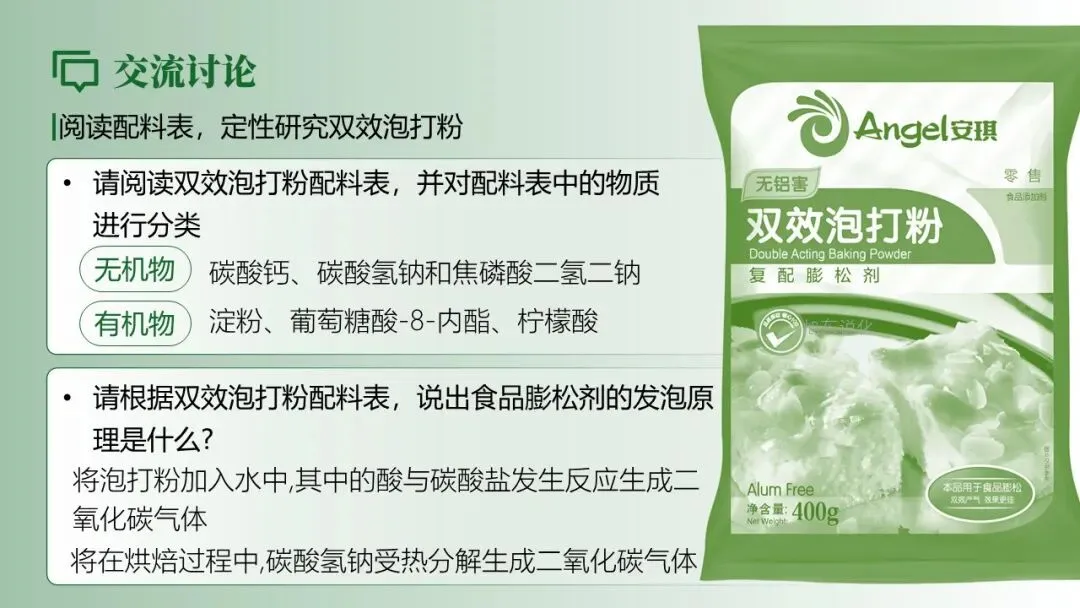 布置任务:“请根据泡打粉配料表,将物质分为无机物和有机物两类,并标注盐类物质”,提供提示信息:柠檬酸、葡萄糖酸 -δ- 内酯、淀粉为有机物,且柠檬酸等酸性物质的水溶液呈酸性。