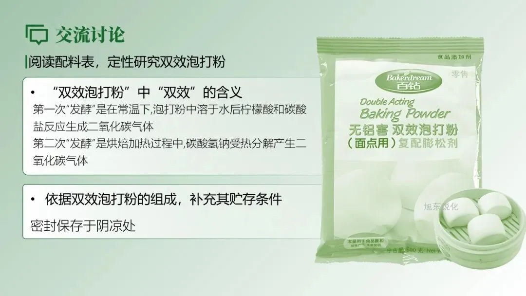 观察图片与配料表,结合生活经验猜测泡打粉的作用原理,激发探究兴趣。