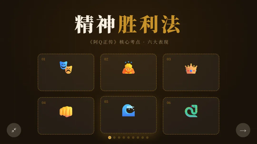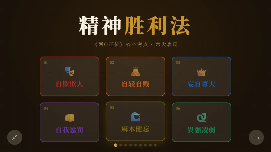 上课讲"精神胜利法的六大表现",我精心设计了动画:先讲自欺欺人,再讲自轻自贱,最后讲妄自尊大……