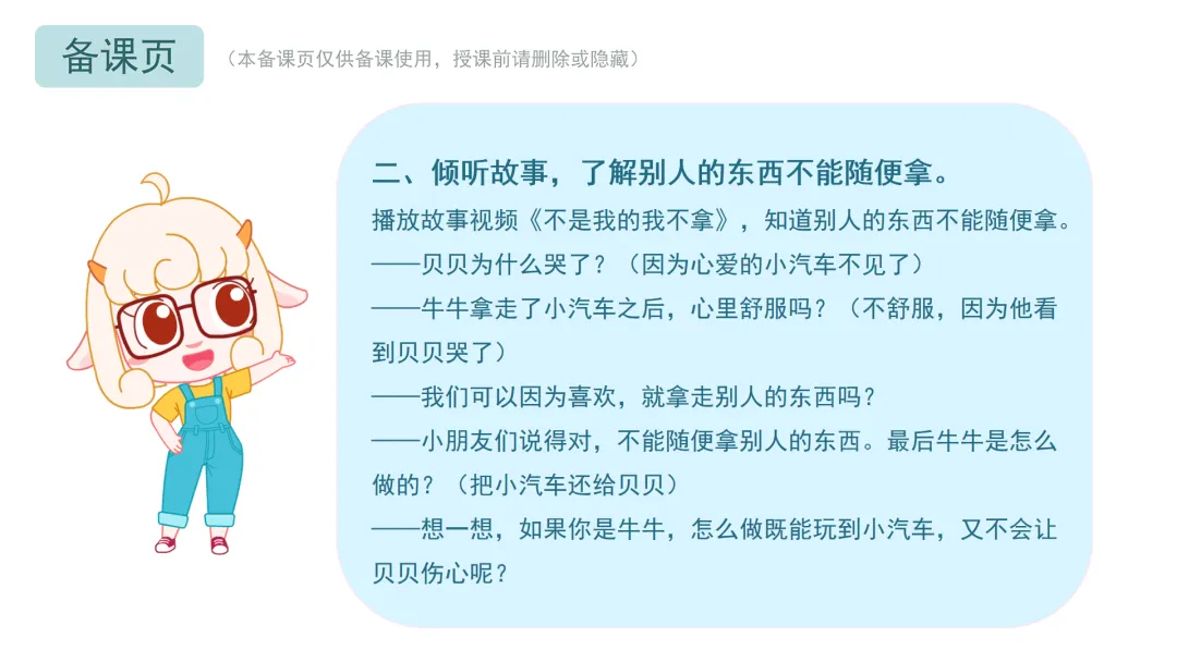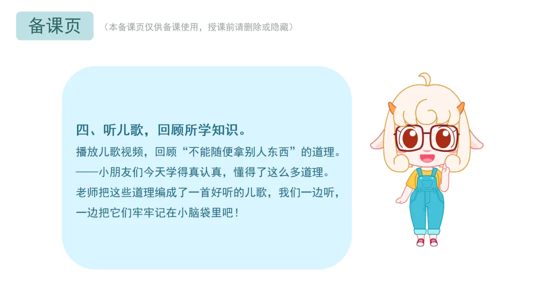 播放儿歌视频,回顾“不能随便拿别人东西”的道理。