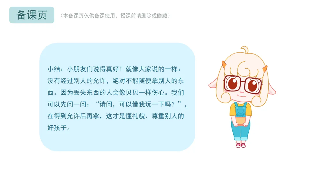 小结:小朋友们说得真好!就像大家说的一样:没有经过别人的允许,绝对不能随便拿别人的东西。因为丢失东西的人会像贝贝一样伤心。我们可以先问一问:“请问,可以借我玩一下吗?”,在得到允许后再拿,这才是懂礼貌、尊重别人的好孩子。
