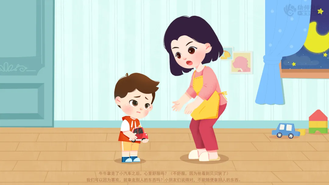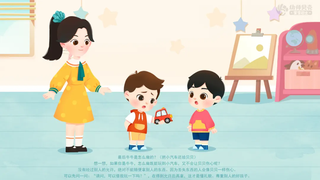 ——小朋友们说得对,不能随便拿别人的东西。最后牛牛是怎么做的?(把小汽车还给贝贝)