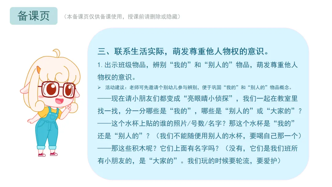 Ø活动建议:老师可先邀请个别幼儿参与辨别,便于巩固“我的”和“别人的”物品概念。