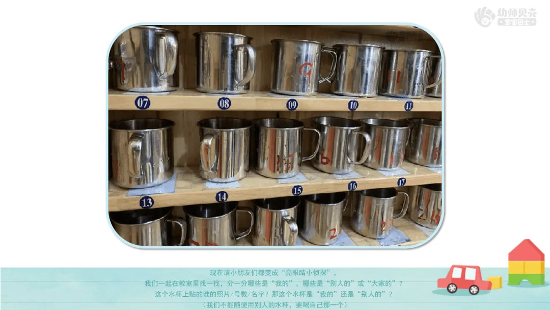 ——这个水杯上贴的谁的照片/号数/名字?那这个水杯是“我的”还是“别人的”?(我们不能随便用别人的水杯,要喝自己那一个)