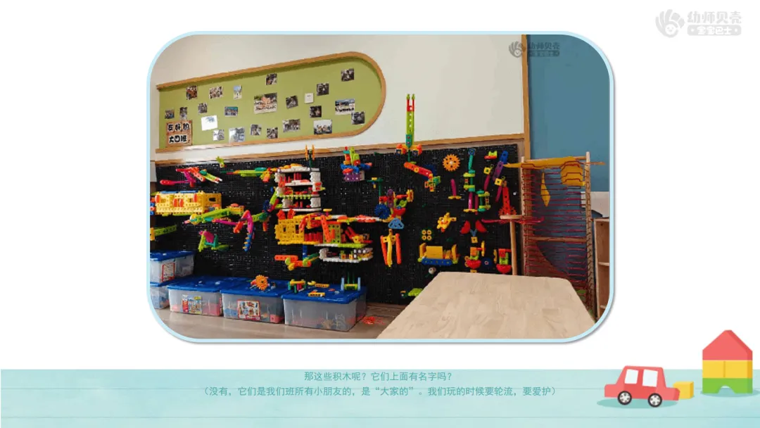 ——那这些积木呢?它们上面有名字吗?(没有,它们是我们班所有小朋友的,是“大家的”。我们玩的时候要轮流,要爱护)