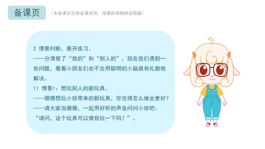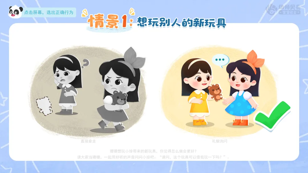 ——分清楚了“我的”和“别人的”,现在我们遇到一些问题,看看小朋友们会不会用聪明的小脑袋有礼貌地解决。