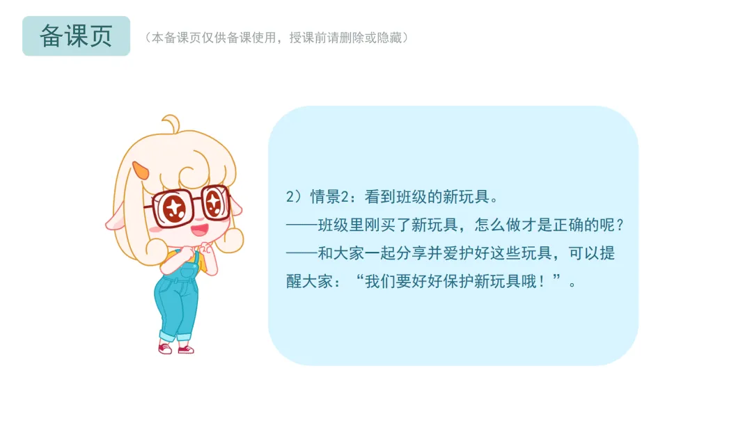 ——和大家一起分享并爱护好这些玩具,可以提醒大家:“我们要好好保护新玩具哦!”。