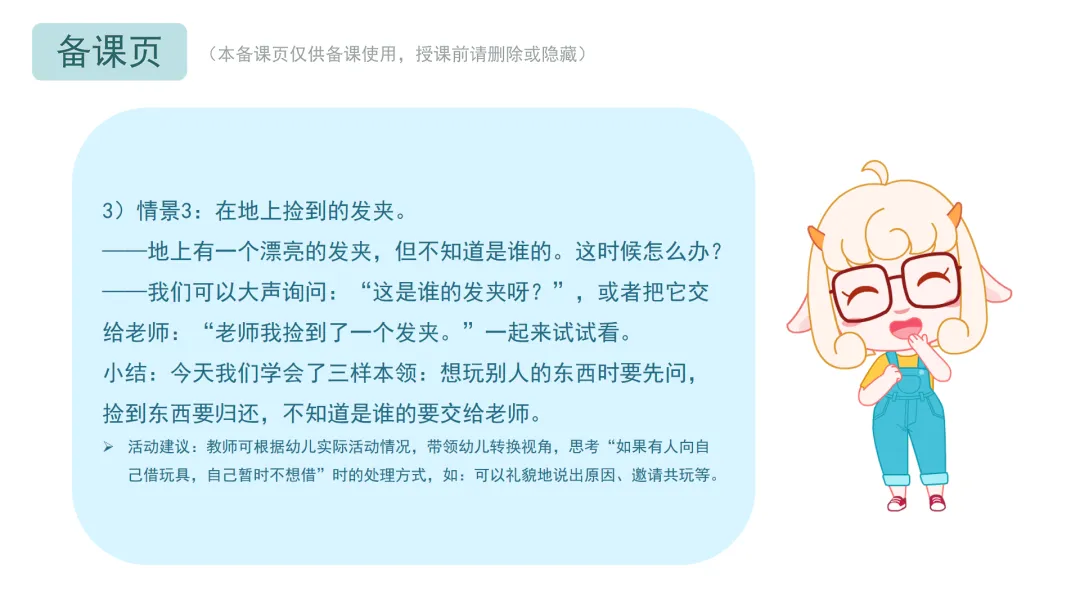 Ø活动建议:教师可根据幼儿实际活动情况,带领幼儿转换视角,思考“如果有人向自己借玩具,自己暂时不想借”时的处理方式,如:可以礼貌地说出原因、邀请共玩等。