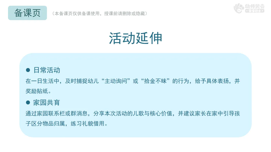 通过家园联系栏或群消息,分享本次活动的儿歌与核心价值,并建议家长在家中引导孩子区分物品归属,练习礼貌借用。