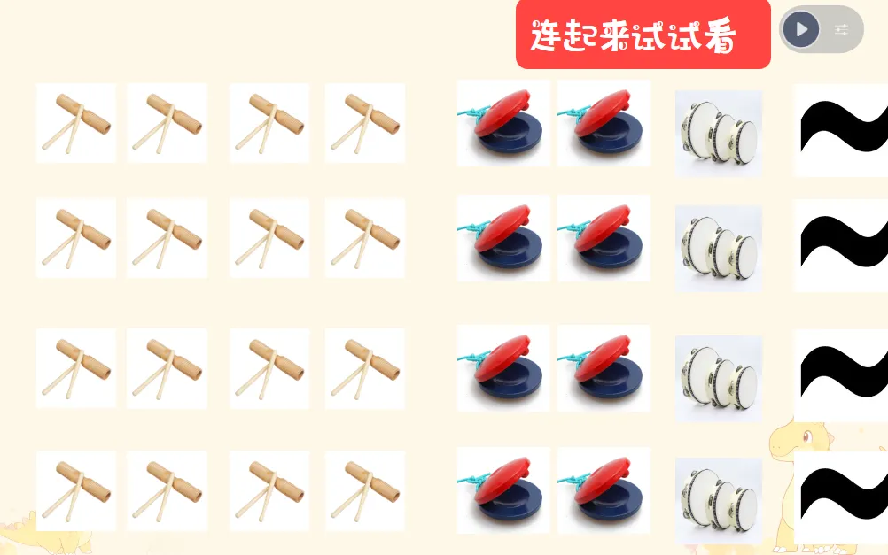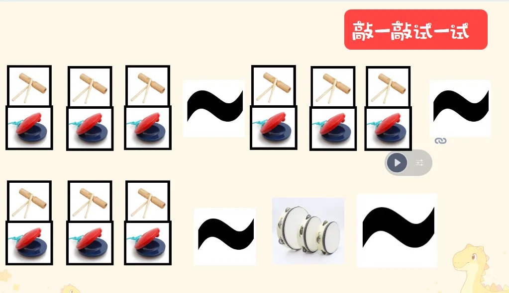 ③ 双响筒组&响板组:“大家发现没有,这一段双响筒和响板的图谱放在一起啦,所以这两组的小朋友需要一起敲响!对应的节奏是三拍‘×××-’,这两组的小朋友要共同敲击三下哦。”