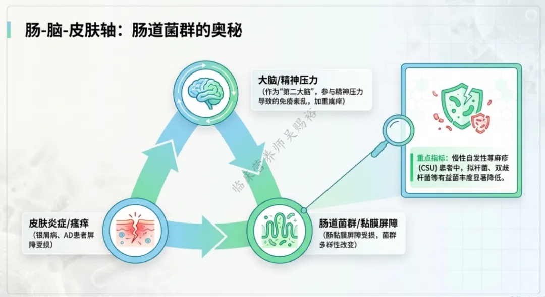 “肠-脑-皮肤轴”理论认为:肠道菌群紊乱 ,影响肠道免疫与屏障功能,同时可通过神经系统(类似“第二大脑”)参与调控。