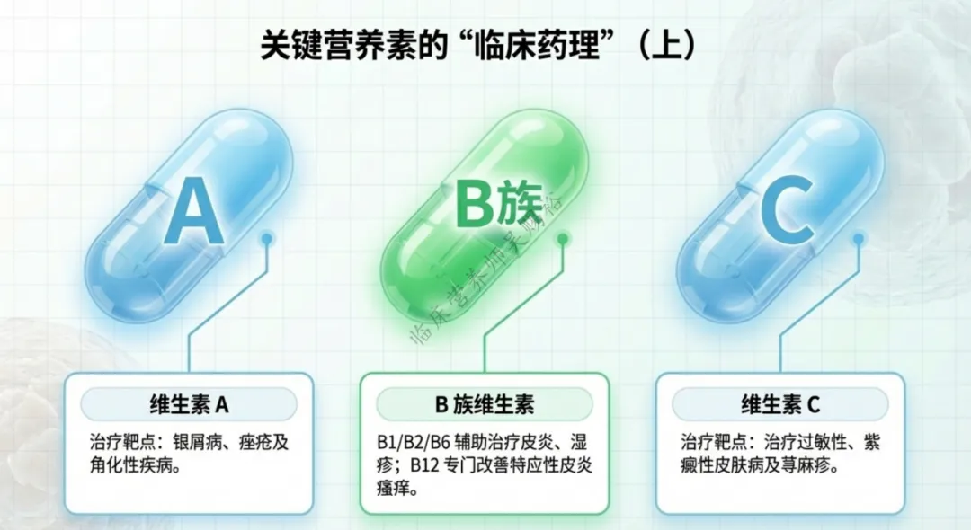 维生素B₁ (硫胺素) | 多用于治疗湿疹、皮炎、各种瘙痒性皮肤病、光敏感性皮肤病等 |