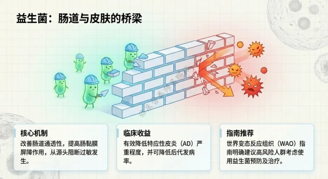 益生菌具有维护肠道菌群平衡、改善肠道通透性、提高肠道消化能力和肠黏膜屏障作用、有效降低过敏的发生,从而恢复特应性皮炎患者肠道菌群稳态,并抑制炎性反应的进一步发展。