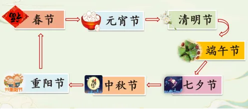预设:春节、元宵节、清明节、端午节、七夕节、中秋节、重阳节。(板书:节日名称)