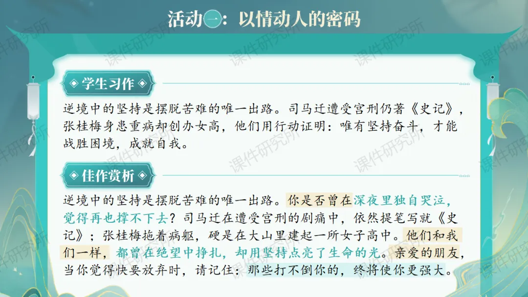 先以习作与名家片段对比引出情理交融主题;再拆解文本提炼三大写作锦囊:植入情感、构建逻辑、巧用修辞;接着结合 “逆境是青春的磨刀石” 演讲任务分层实战;最后探讨文雅表达的当代价值,布置书信作业,实现从文本赏析到技法迁移的完整闭环。