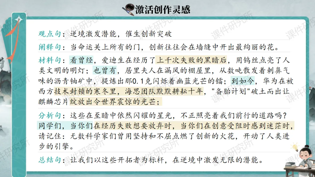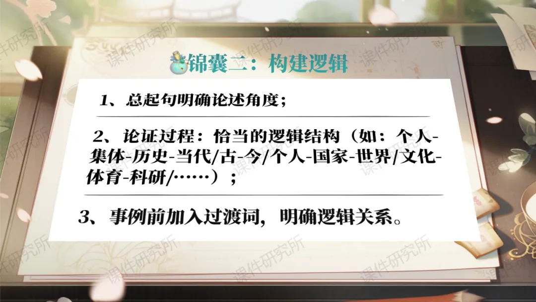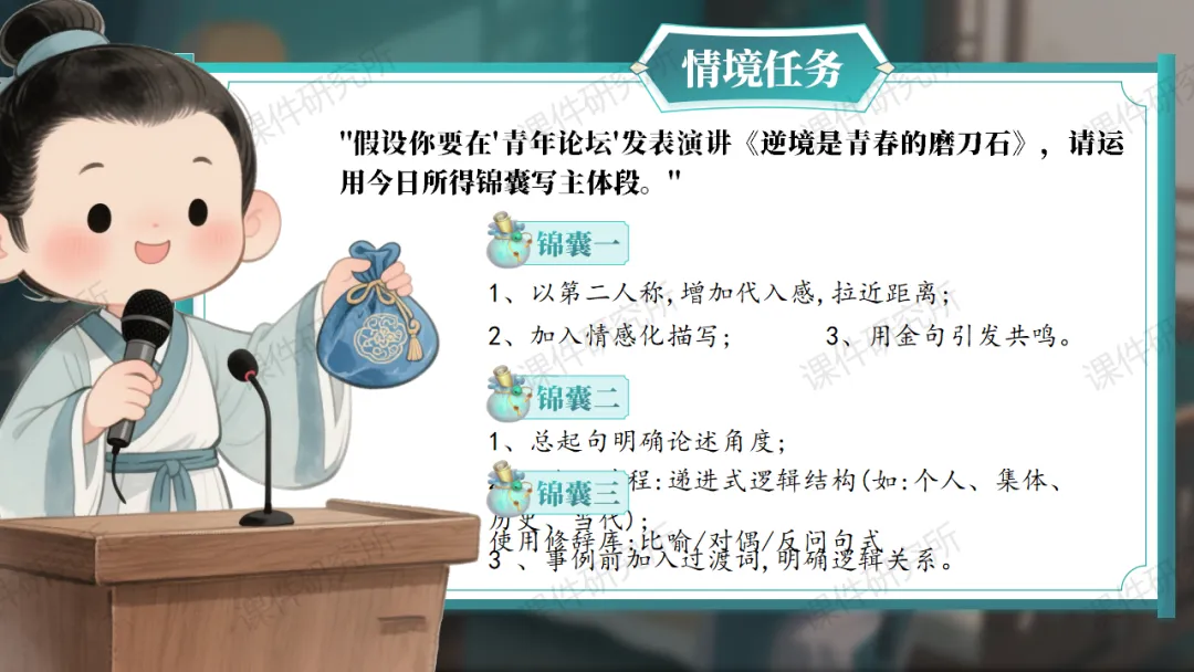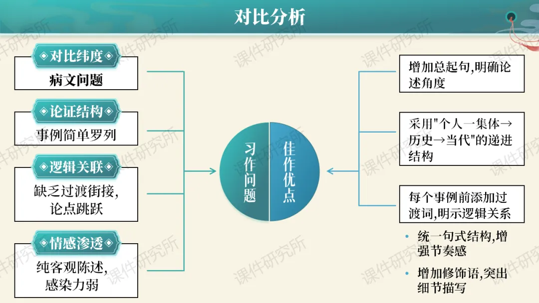 老师原本的课件逻辑清晰,写作技巧实操性强,经过磨课且由我们专业免费美化后,更加亮眼。如果你想了解详细的设计思路,可以加入高中语文议节好课教研群,观看磨课回放。