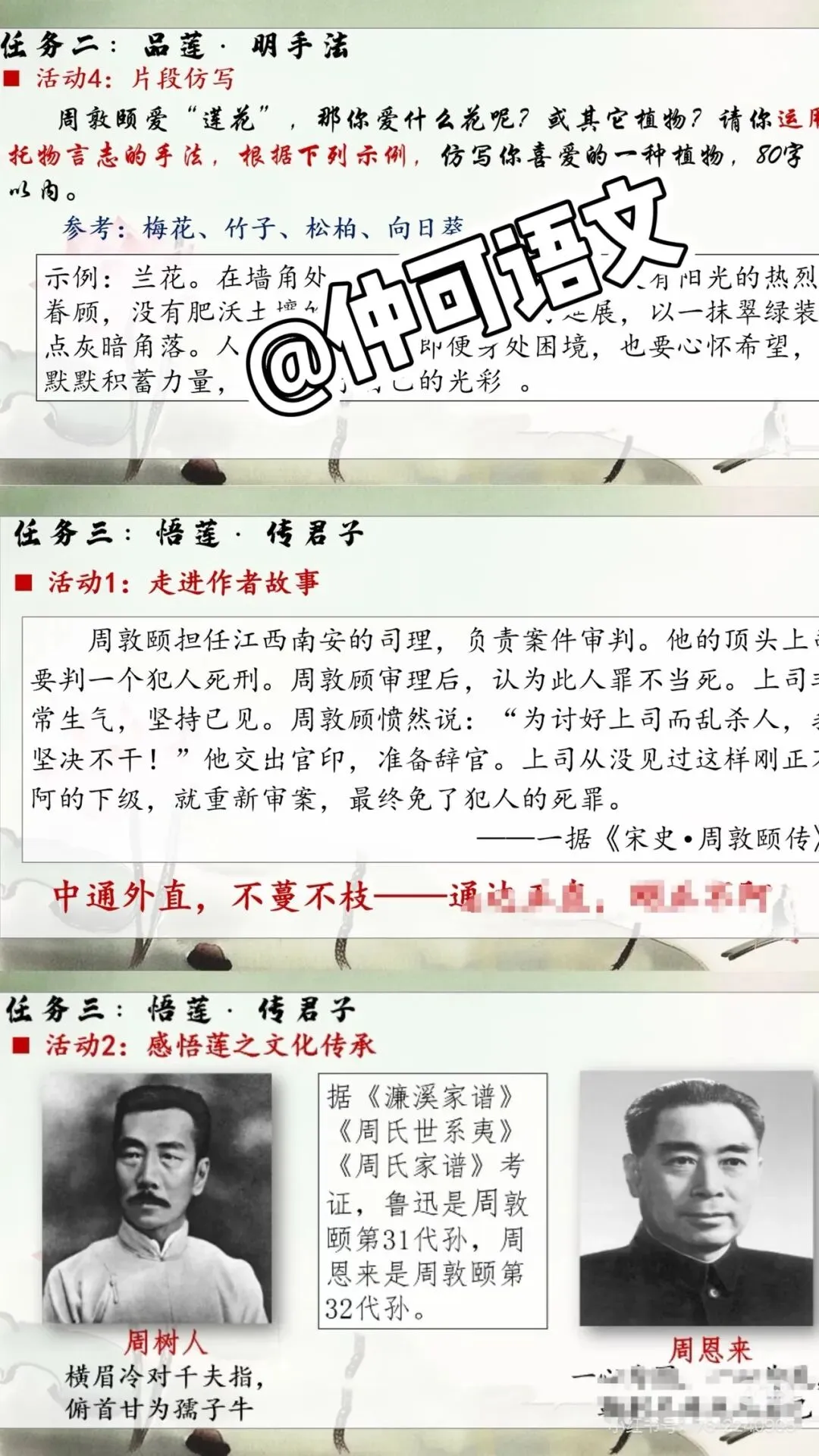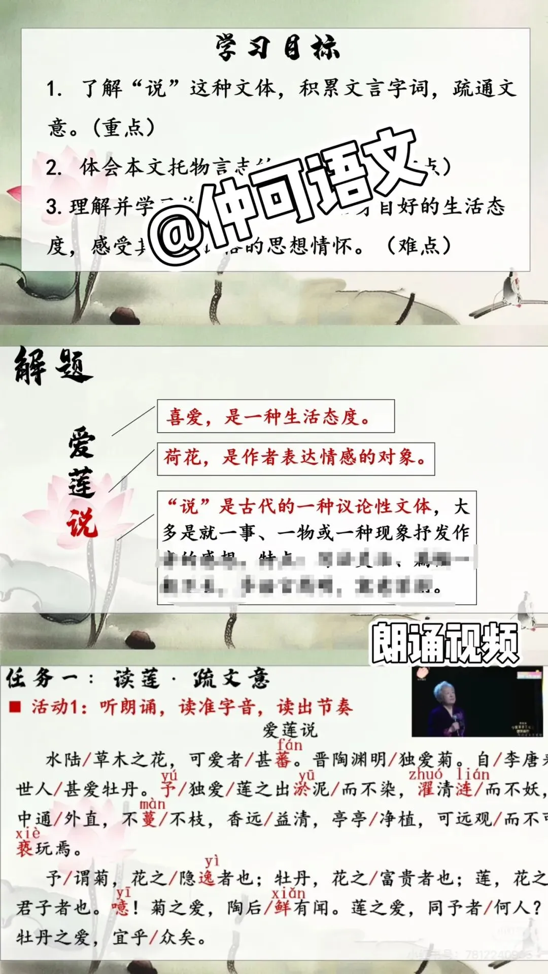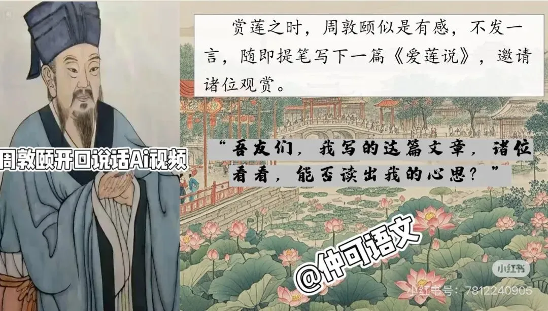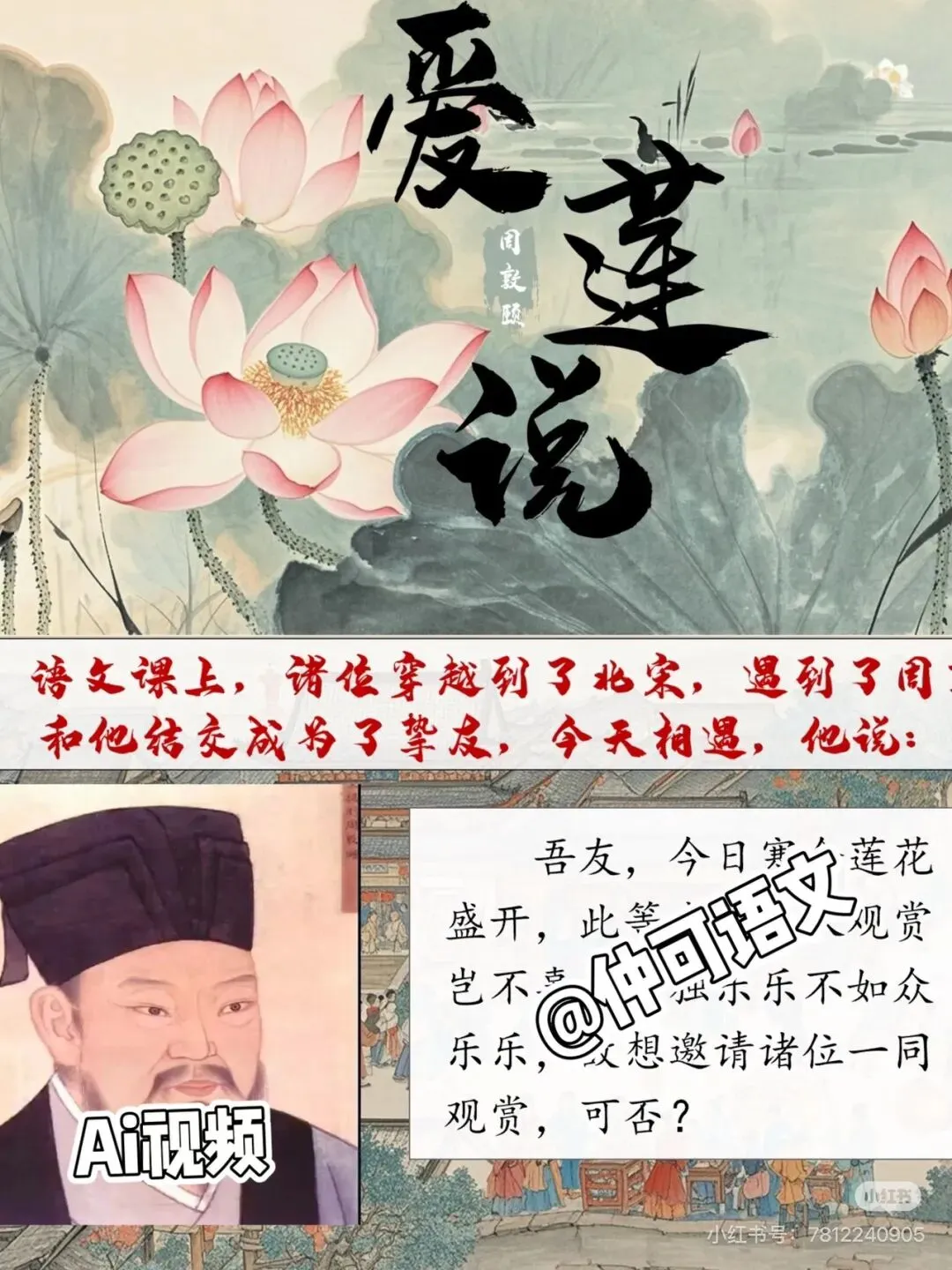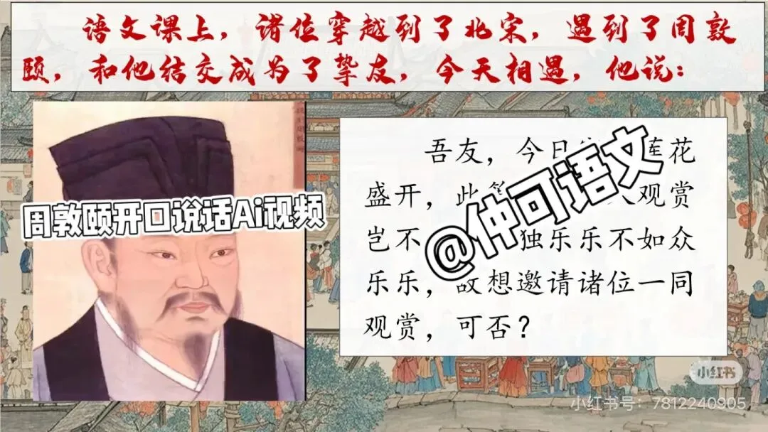 ❣️思路设计:情境导入:通过设置语文课上,学生穿越到了北宋,遇到了周敦颐,和他结交成为了挚友,今天相遇,他说,视频Ai周敦颐开口说话:“吾友,今日寒舍莲花盛开,此等盛景一人观赏岂不辜负,独乐乐不如众乐乐,故想邀请诸位一同观赏,可否?”从而引出本课课题《爱莲说》;通过三个任务完成学习,先听朗诵,翻译文言字词,接着疏通文意,再明确手法,最后再感悟作者的高尚情操并升华达到育人作用。