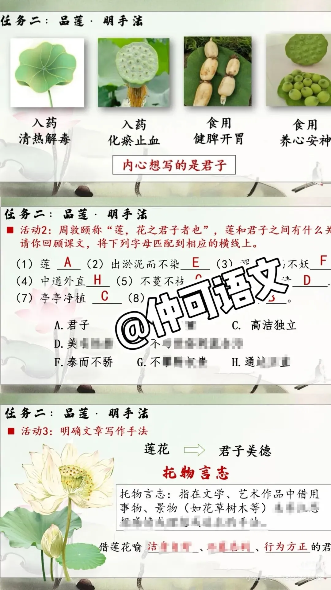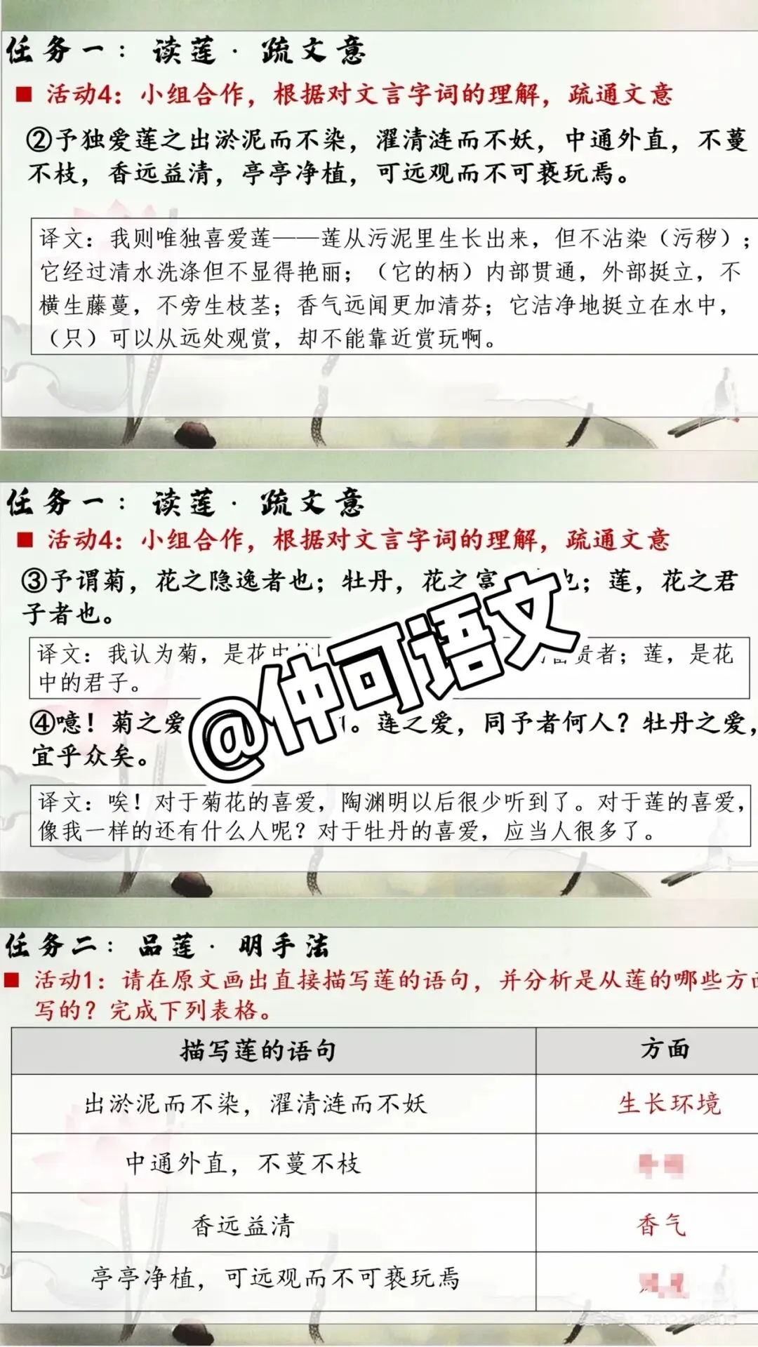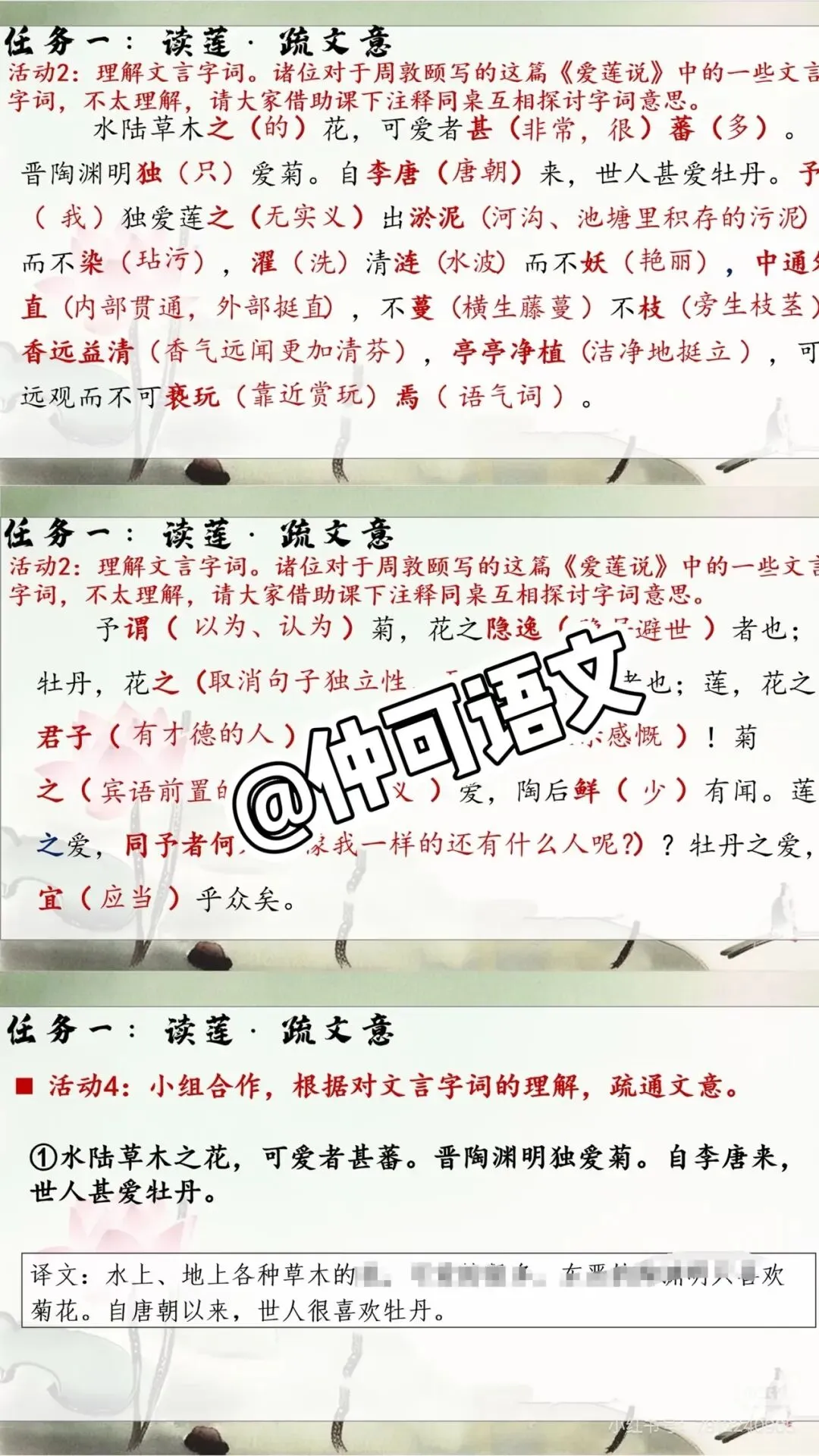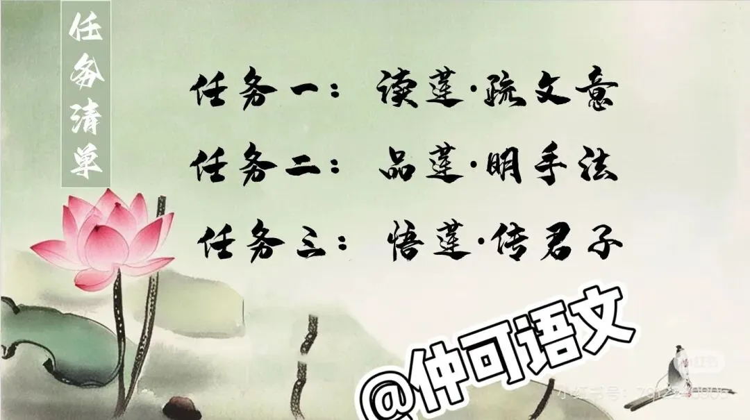 ❣️思路设计:情境导入:通过设置语文课上,学生穿越到了北宋,遇到了周敦颐,和他结交成为了挚友,今天相遇,他说,视频Ai周敦颐开口说话:“吾友,今日寒舍莲花盛开,此等盛景一人观赏岂不辜负,独乐乐不如众乐乐,故想邀请诸位一同观赏,可否?”从而引出本课课题《爱莲说》;通过三个任务完成学习,先听朗诵,翻译文言字词,接着疏通文意,再明确手法,最后再感悟作者的高尚情操并升华达到育人作用。