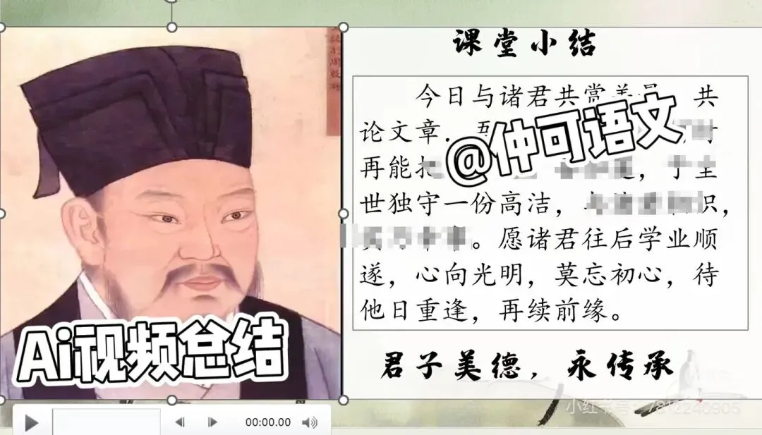 最后课堂小结部分设计:通过Ai视频做结,内容通过周敦颐的口中说出:共论文章接近尾声,分别在即,周敦颐有话和大家说,和开头的导入来个首尾呼应~
