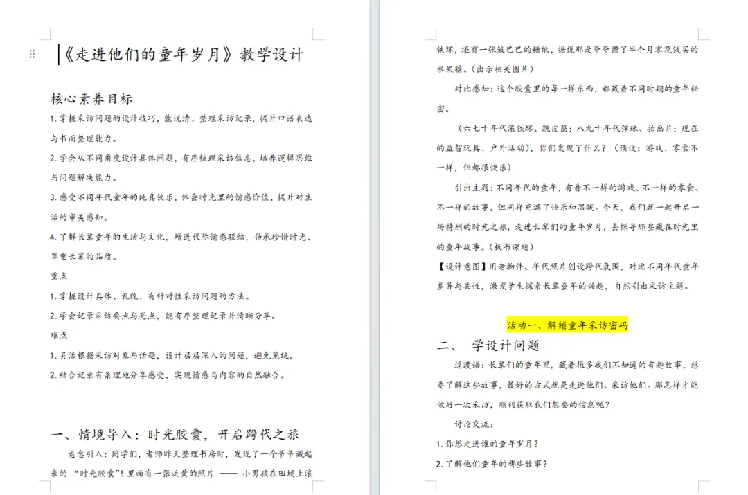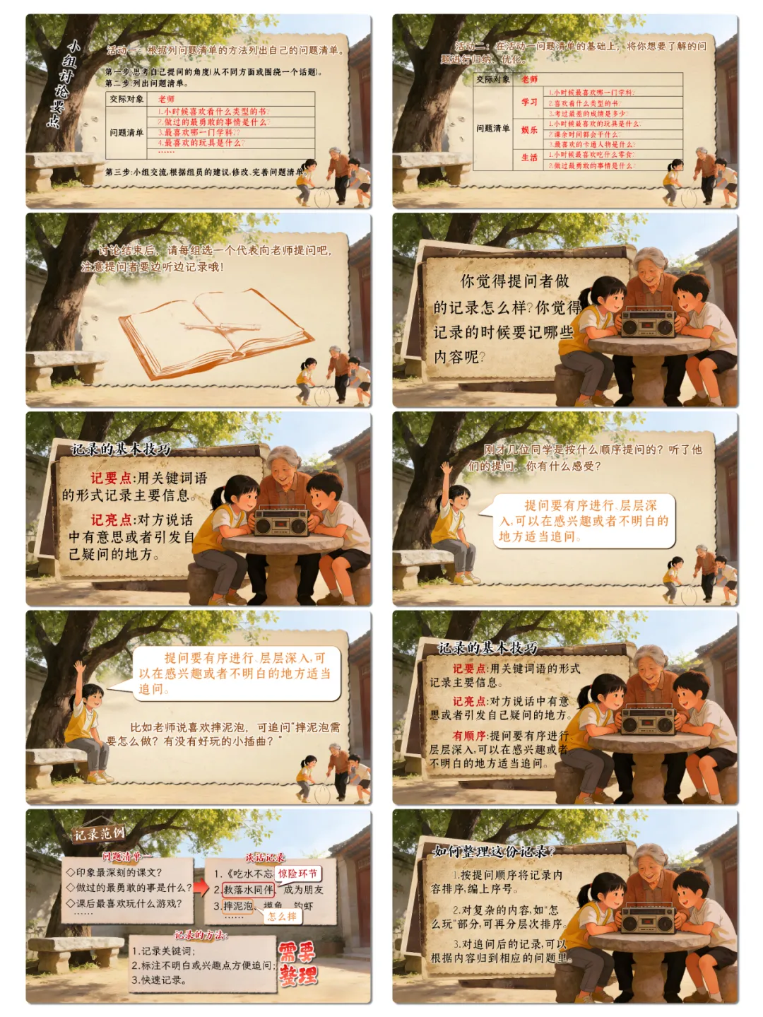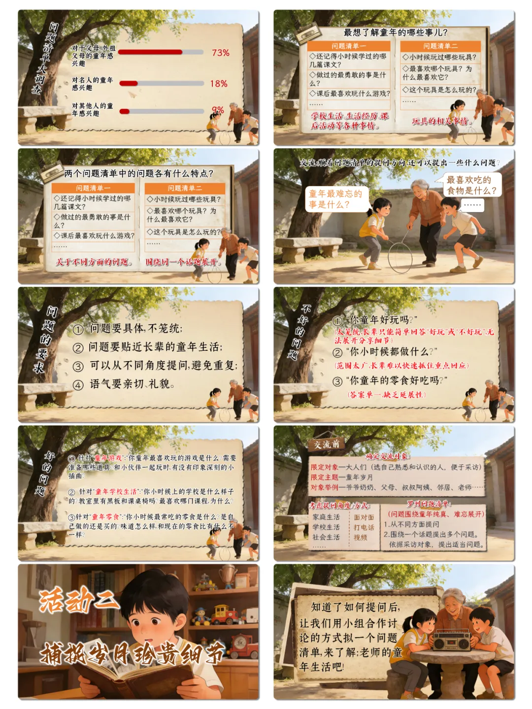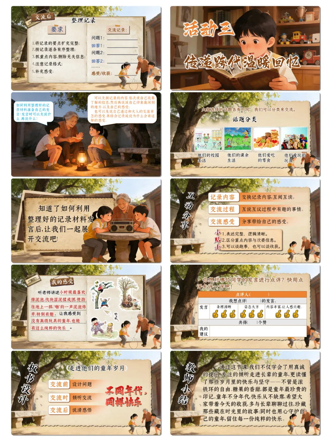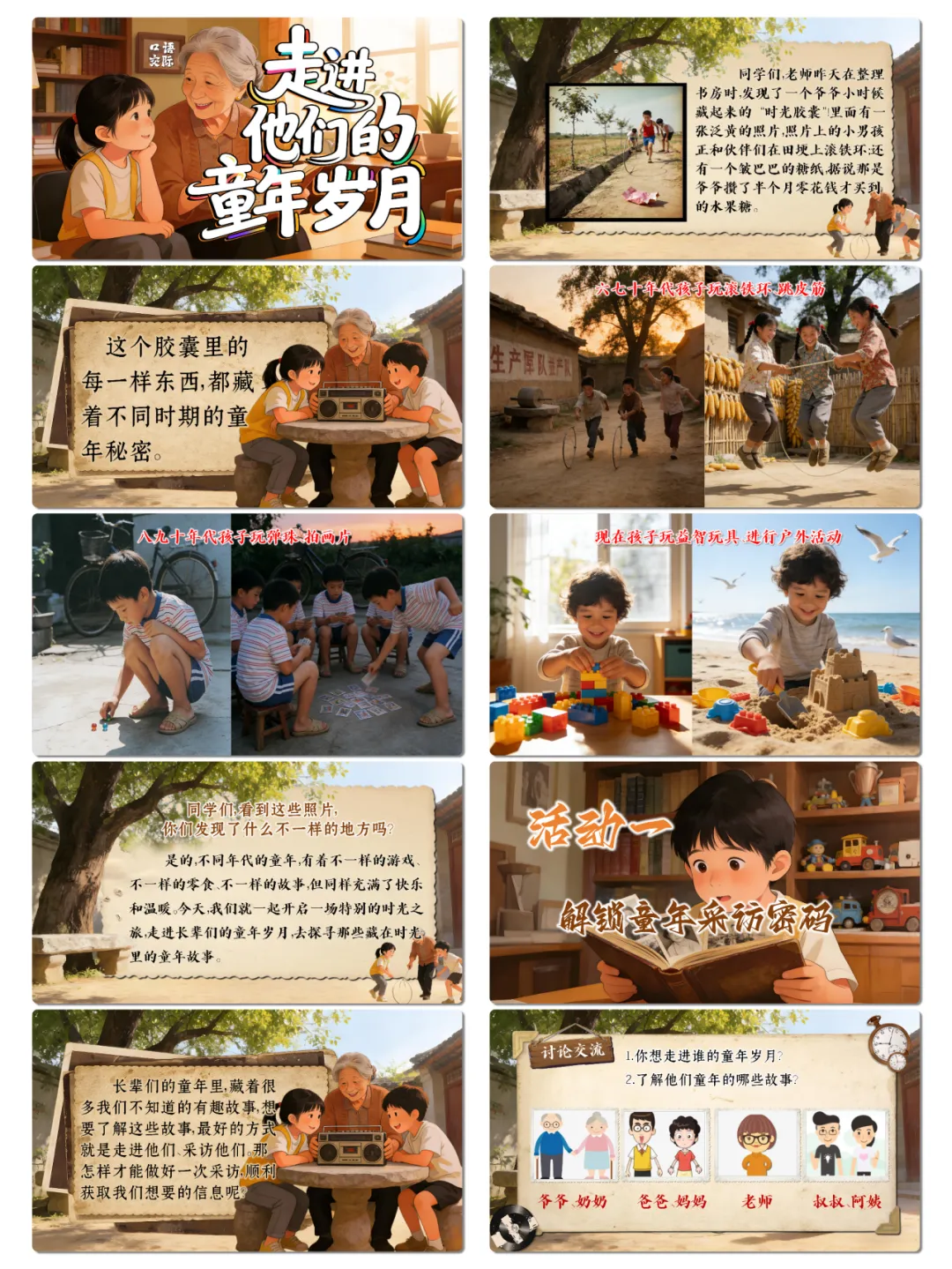 引出主题:不同年代的童年,有着不一样的游戏、不一样的零食、不一样的故事,但同样充满了快乐和温暖。今天,我们就一起开启一场特别的时光之旅,走进长辈们的童年岁月,去探寻那些藏在时光里的童年故事。(板书课题)